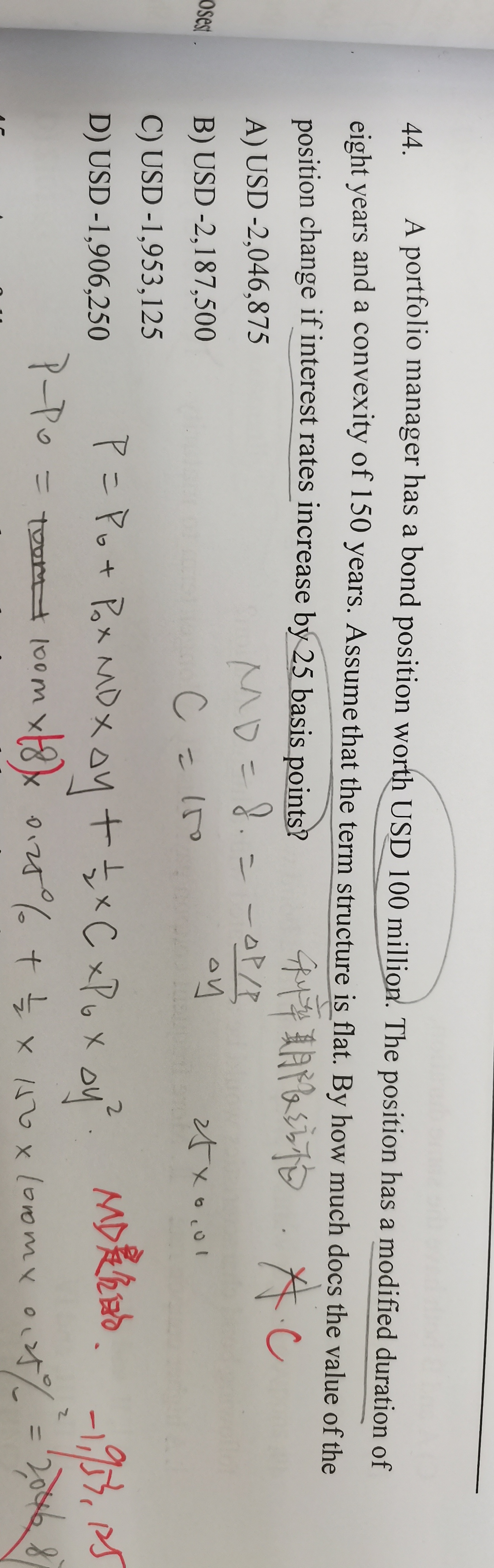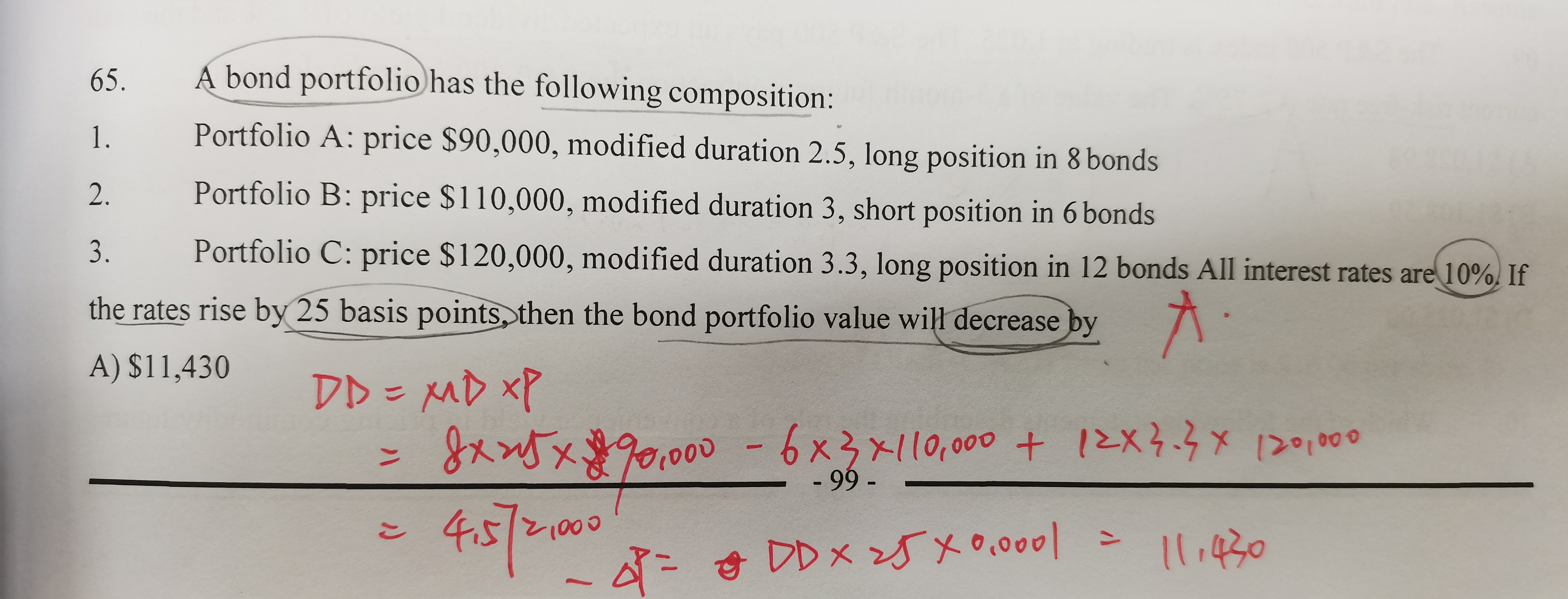 同学你好,正常情况下,计算公式中的久期是需要加负号的,第二道题没有加负号是因为题干中直接问的就是当利率上升某个基点时,债券价值下降多少,已经考虑了方向性,所以计算时就不用再加负号了。