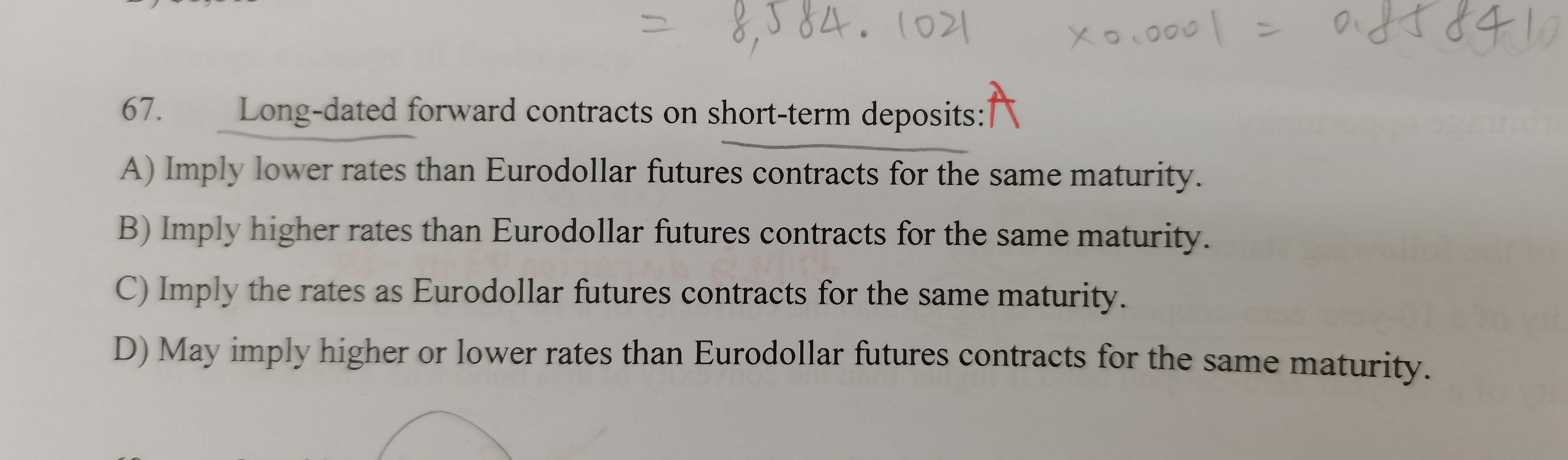 同学你好,这道题考察的是标的资产为短期存款的远期合约的利率与对应期限的期货合约隐含利率之间的大小关系,因为标的资产(短期存款)与利率之间是负相关关系,根据凸度调整原则(远期利率=期货隐含利率-1/2*西格玛^2*T1T2),,所以对应期限的远期利率应该小于对应期限的期货隐含利率。