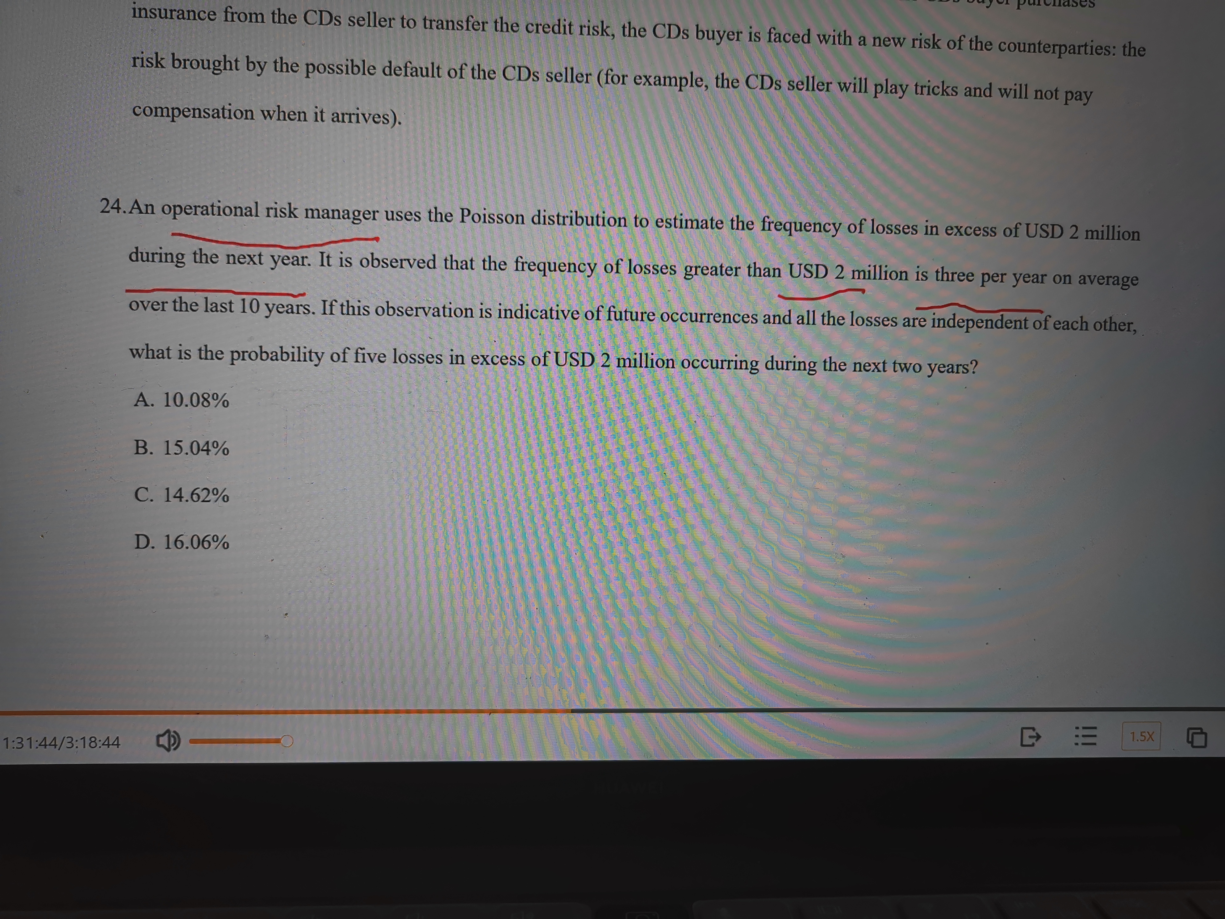 同学你好,这道题考察的就是泊松分布的计算,过去10年平均每年损失次数是3次,那么平均两年的损失次数就是6次(每次损失之间是独立的,所以直接用np计算n年损失的次数),题目让求未来两年损失5次的概率是多少,那么莱姆达=3×2=6,x=5,带入泊松分布的计算公式即可。