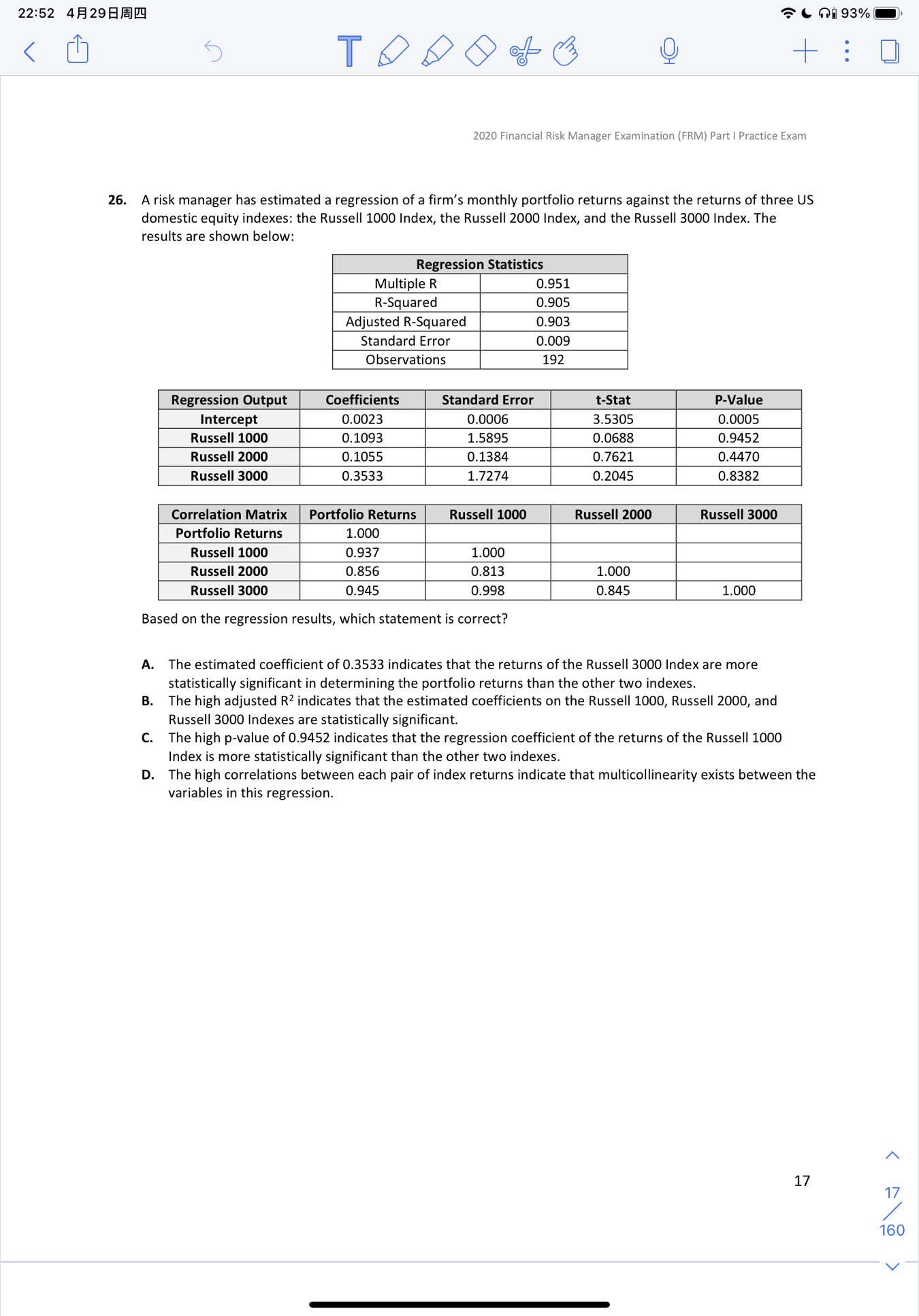 同学你好,检验回归系数是否显著是要看回归系数对应的t检验统计量与对应的关键值比较,通过计算,Russel 3000回归系数对应的t检验统计量计算结果并不比其他两个回归系数大,所以A错,关于B选项,R方只是解释整个回归方程的解释力度,跟单个回归系数是否显著没有直接关系。所以B错