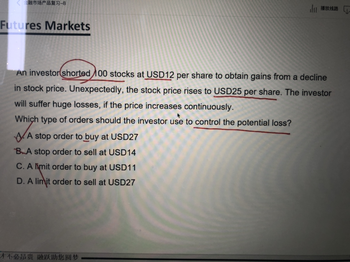 同学你好,limit order的作用是为了锁定目标成交价,而stop order的作用是为了止损,题干的背景就是该投资者在价格朝着跟自己的预期价格变动方向相反的方向变动了,所以就可以直接排除limit order,当价格继续上涨,应该通过高于目前市价一点的价格进行买入来弥补之前因为卖出造成的损失。