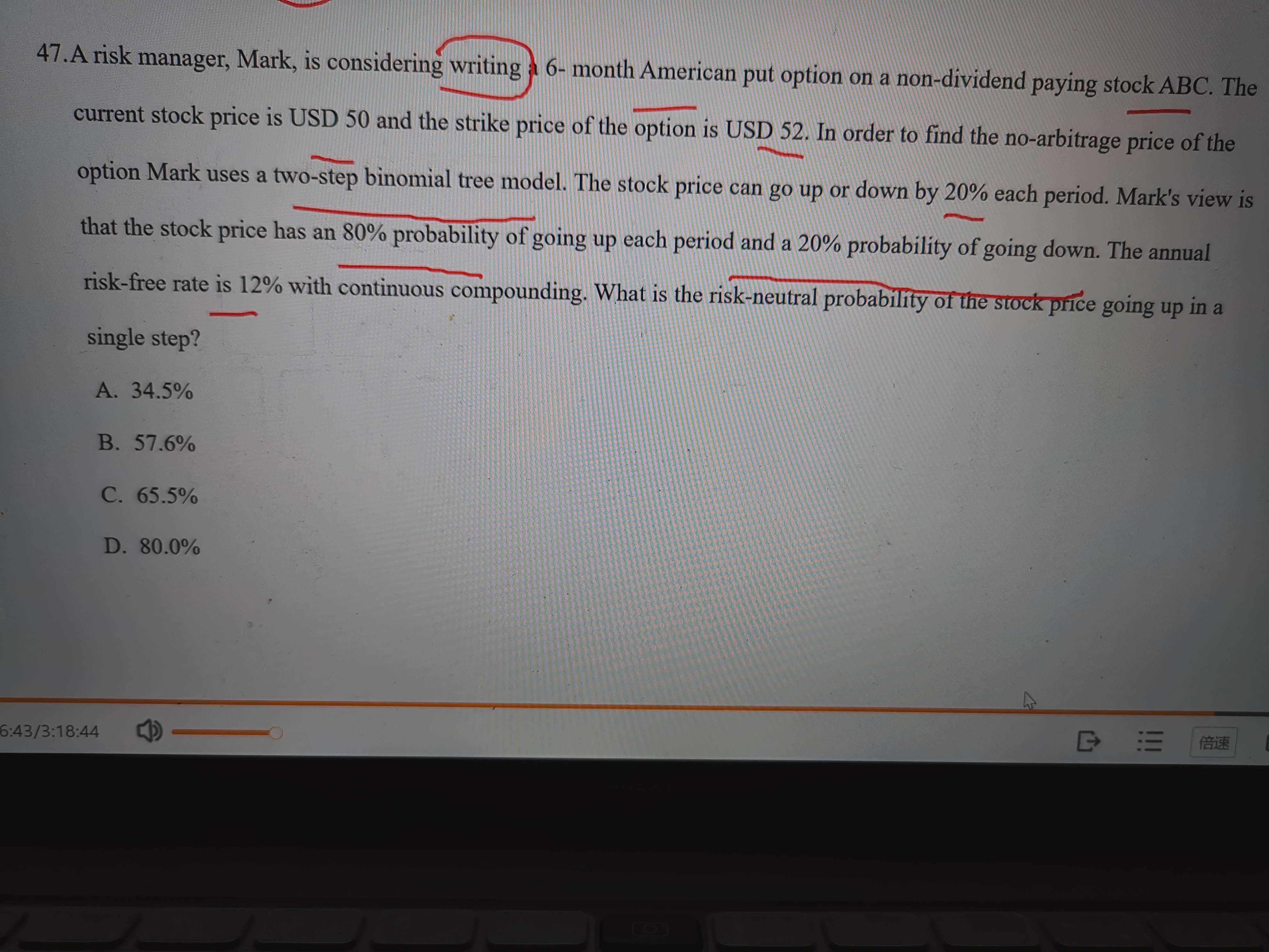 同学你好,这道题让求的风险中性下的上涨概率,带入公式即可:Pu=e^rt-d/u-d,题干中给出的80%上涨概率是个人观点,是干扰条件。