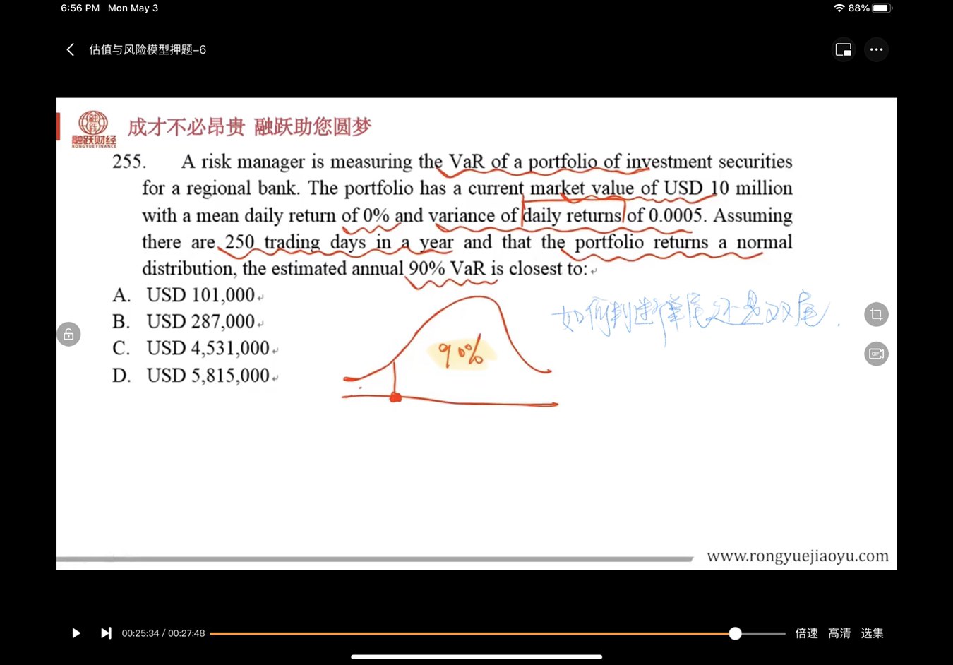 风险管理中最重要的是衡量损失,var作为损失的度量是单尾,双尾一般主要用在假设检验中。