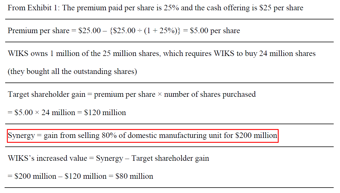 不用计算啊,题目里面告诉我们因为兼并了国外的生产商,从而80%国内的生产商削减带来了200M,这200m直接就是synergy,表示由于兼并收购带来的额外收益,计算方法是兼并后的哥哥企业价值之和减去兼并之前各企业价值之和,类似经济学中正的外部性的定义,昨天老师给你的回复有几个字没有显示,应该是兼并后的总收益减去兼并之前的。