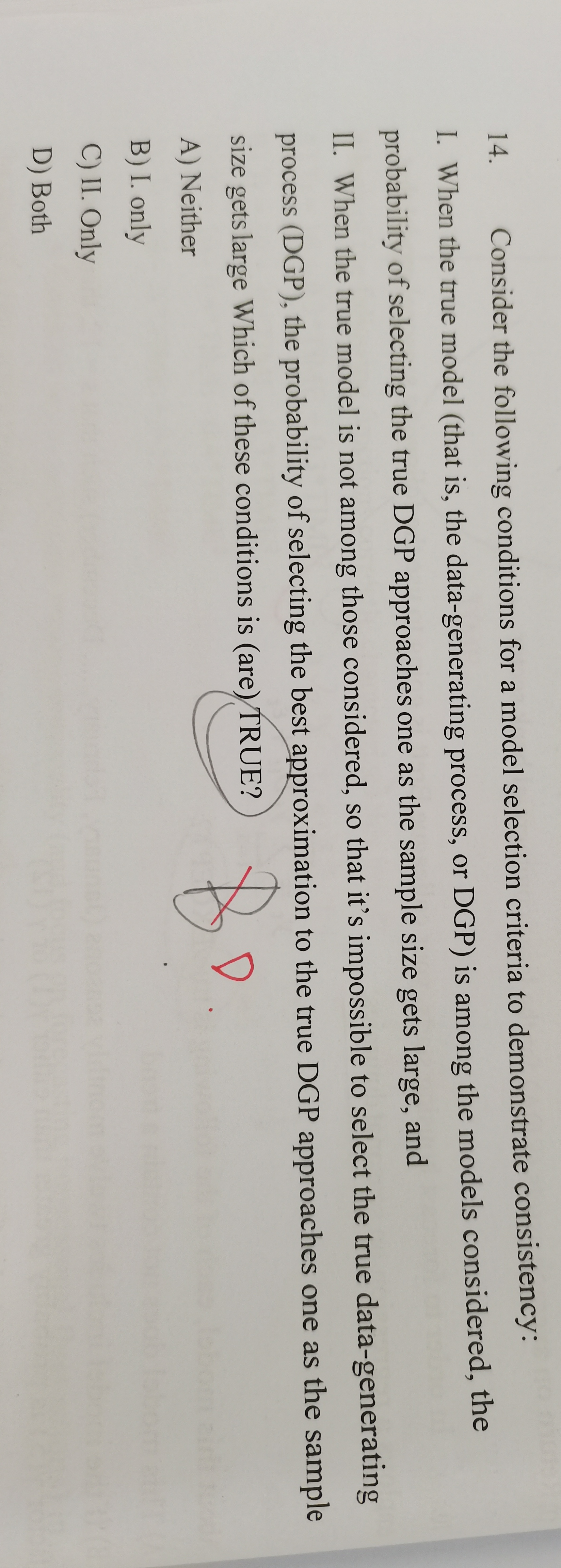 同学你好,这道题考察的是一致性的两个特征:第一,当真实模型存在于所考虑的模型样本中的话,那么随着模型样本量的增加,选出真实模型的概率增加,第二,当真实模型不存在于所考虑的模型样本中时,那么随着模型样本量的增加,选出的模型越接近于真实模型。所以两个说法都对。