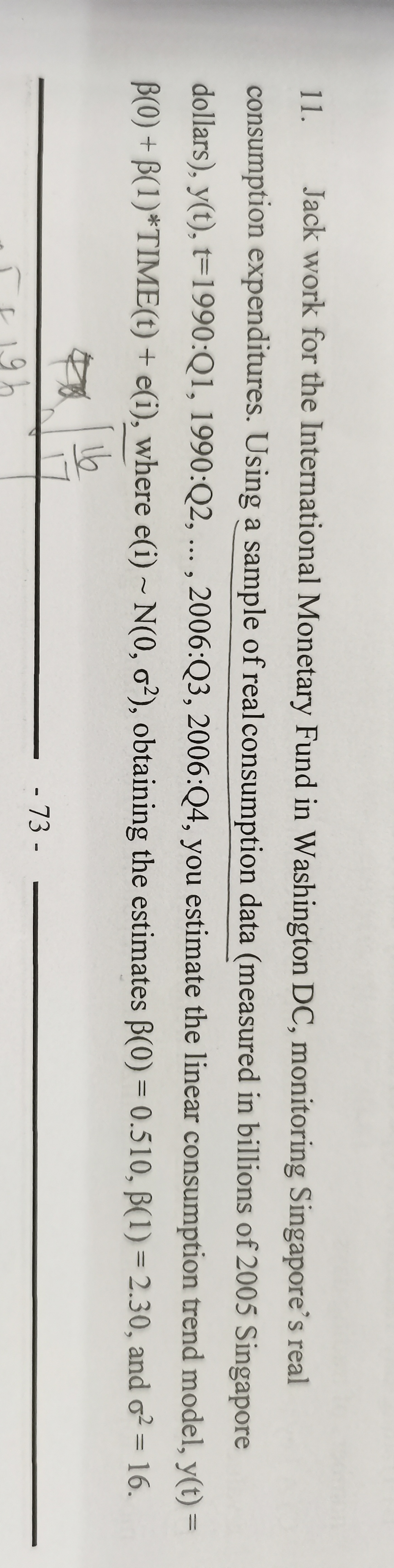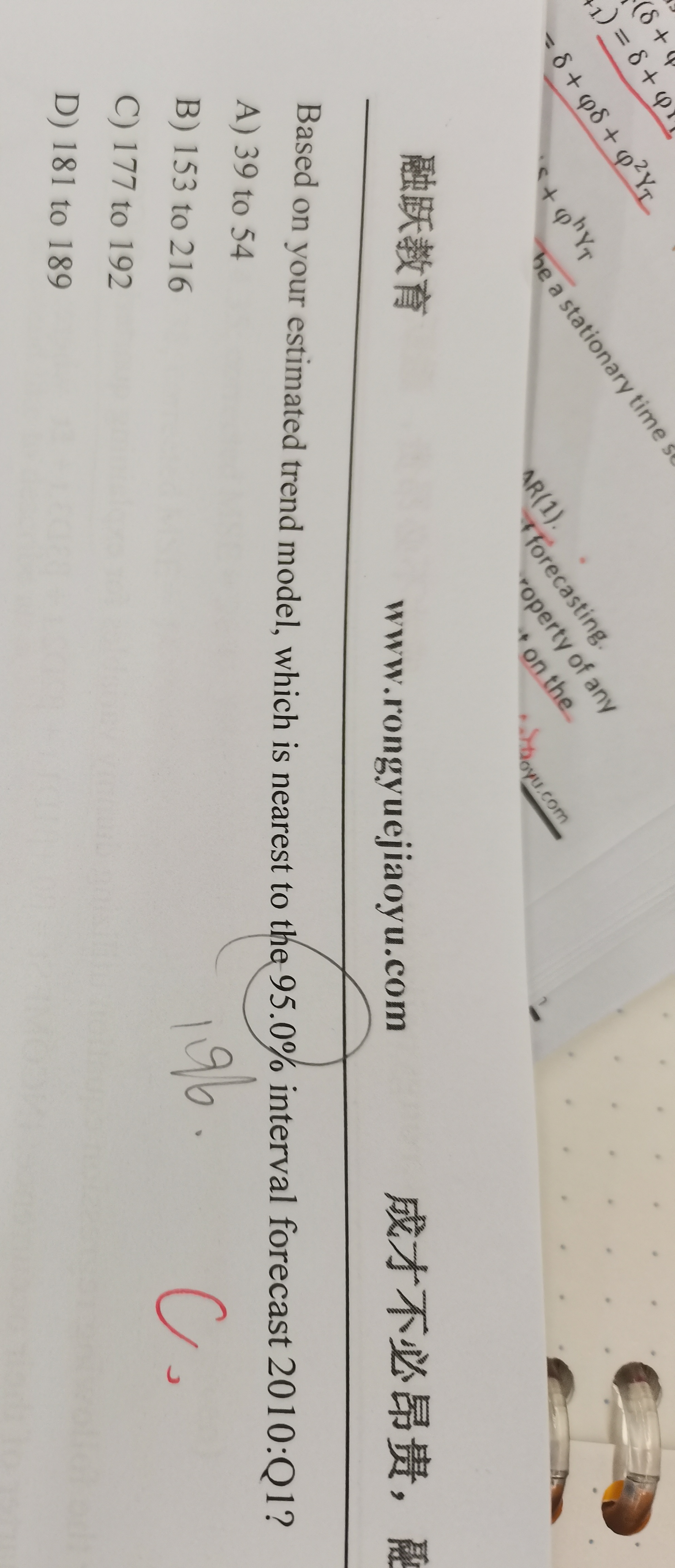 同学你好,这道题让求的是2010年第一季度数据在95%置信水平下的置信区间,第一步要先计算出2010年第一季度的预测均值「把时间t=20(因为从1990年第一季度开始算到2010年第一季度其实就是第20个季度)带入回归方程yt=0.510+2.3*t即可算出」,然后又已知标准差,就可以计算出最终结果。