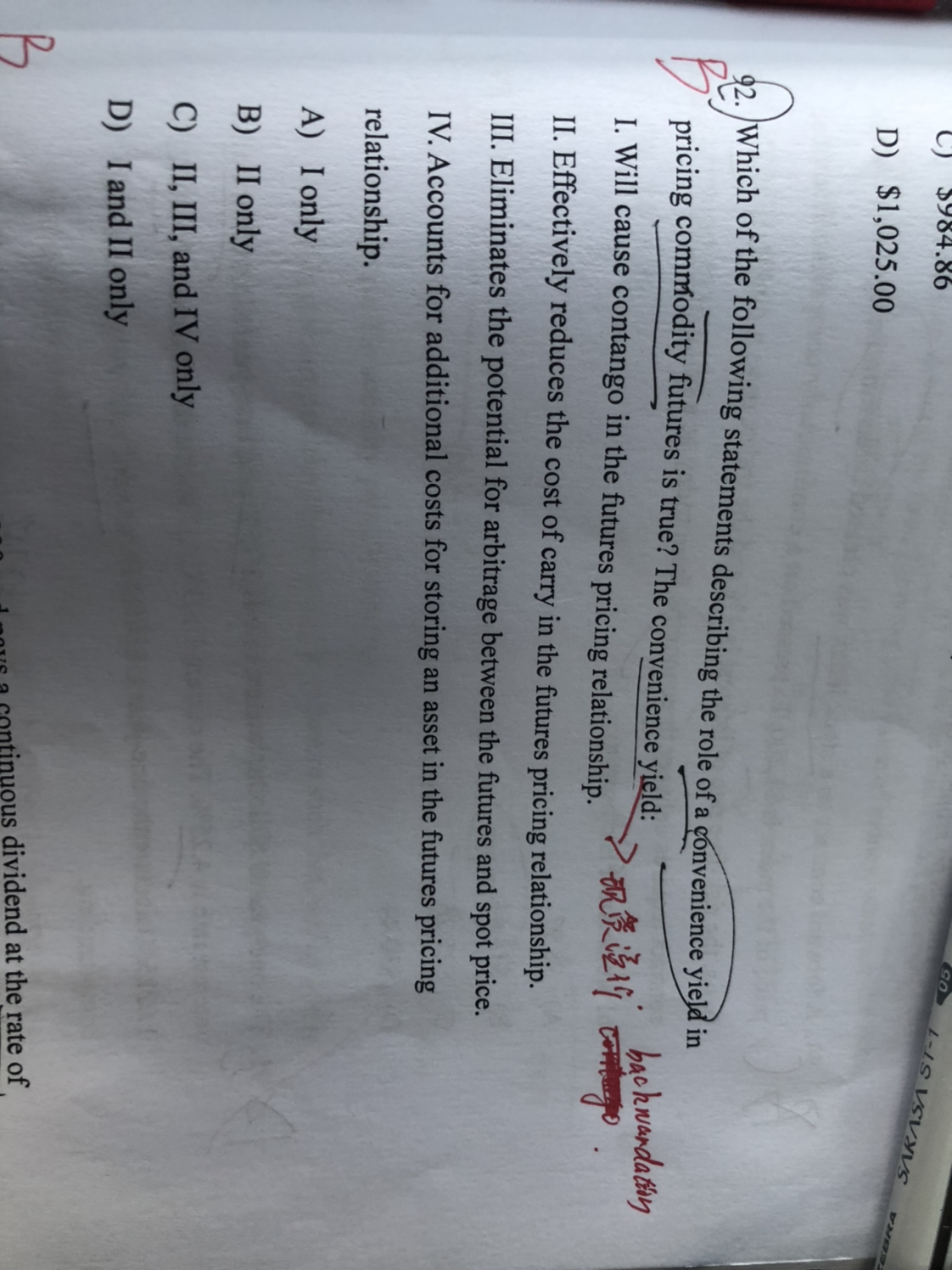 同学你好,convenience yield是便利性收益率,会给现货持有人带来收益,所以在计算期货价格时要减去,导致期货价格降低,从而引起现货价格上升产生溢价,你也可以直接理解为,便利性收益是对现货持有人有利,所以要加在现货成本里面,造成现货溢价。
