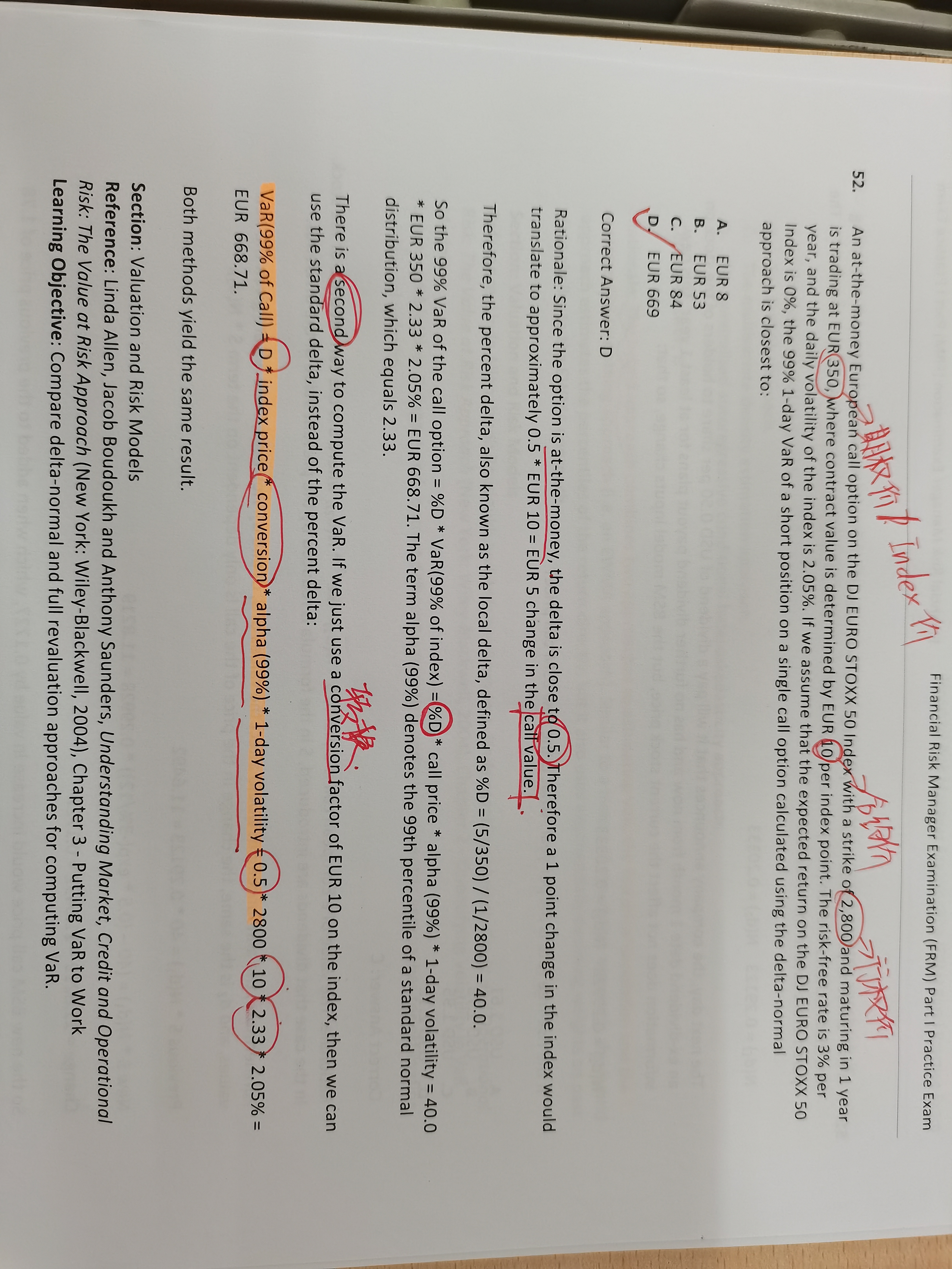 同学你好,这道题有点问题,350和2800分别是指数的现在市场价格和对应期权的行权价,这里的价格都是点位数(就像是上证3000点),而10是转换因子,也就是一个点位多少钱,计算公式是用ndelta-noraml法计算期权的VaR值,同学了解即可。