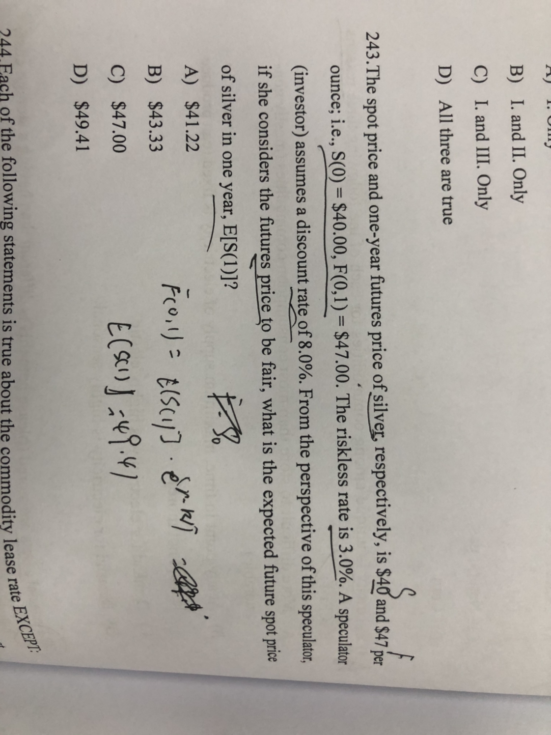 同学你好,discount rate是折现率的意思,因为是要求预期未来一年现货的期货价格,所以需要先根据题干条件用现在市场期货价格折现到推出理论上的现货价格,然后再利用期货定价公式计算出来未来理论期货理论价格,这道题有些绕,参考图片理解