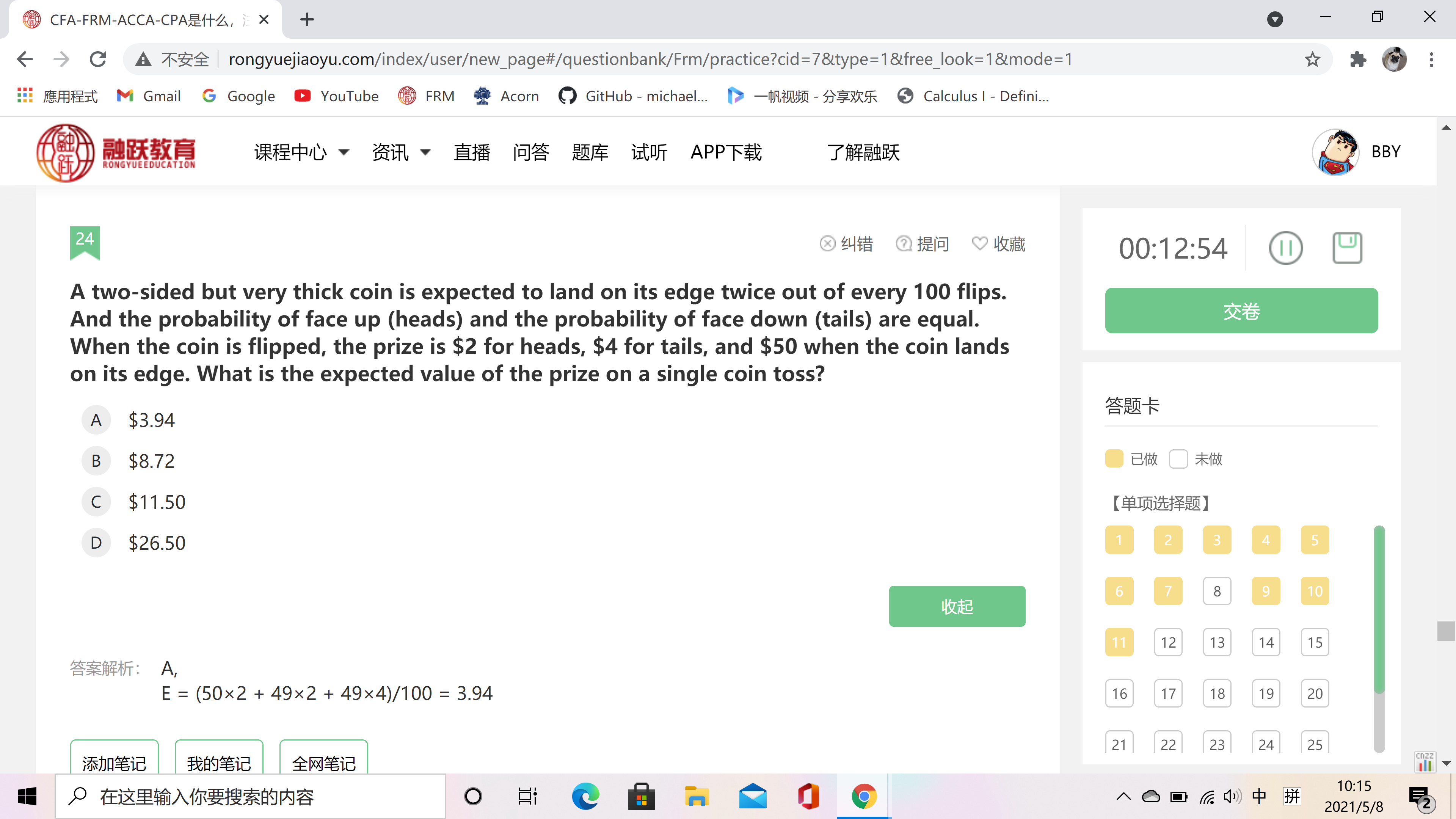 同学你好,这道题说的是抛硬币实验,100次两次立起来的次数是2次,概率即为2%,正面朝上和反面朝上的概率相等,那么就是(1-2%)/2=49%,然后又说立起来奖励50元,正面朝上奖励2元,反面朝上奖励4元,最后让求抛一次硬币预期能得到多少奖励,就是加权平均值。