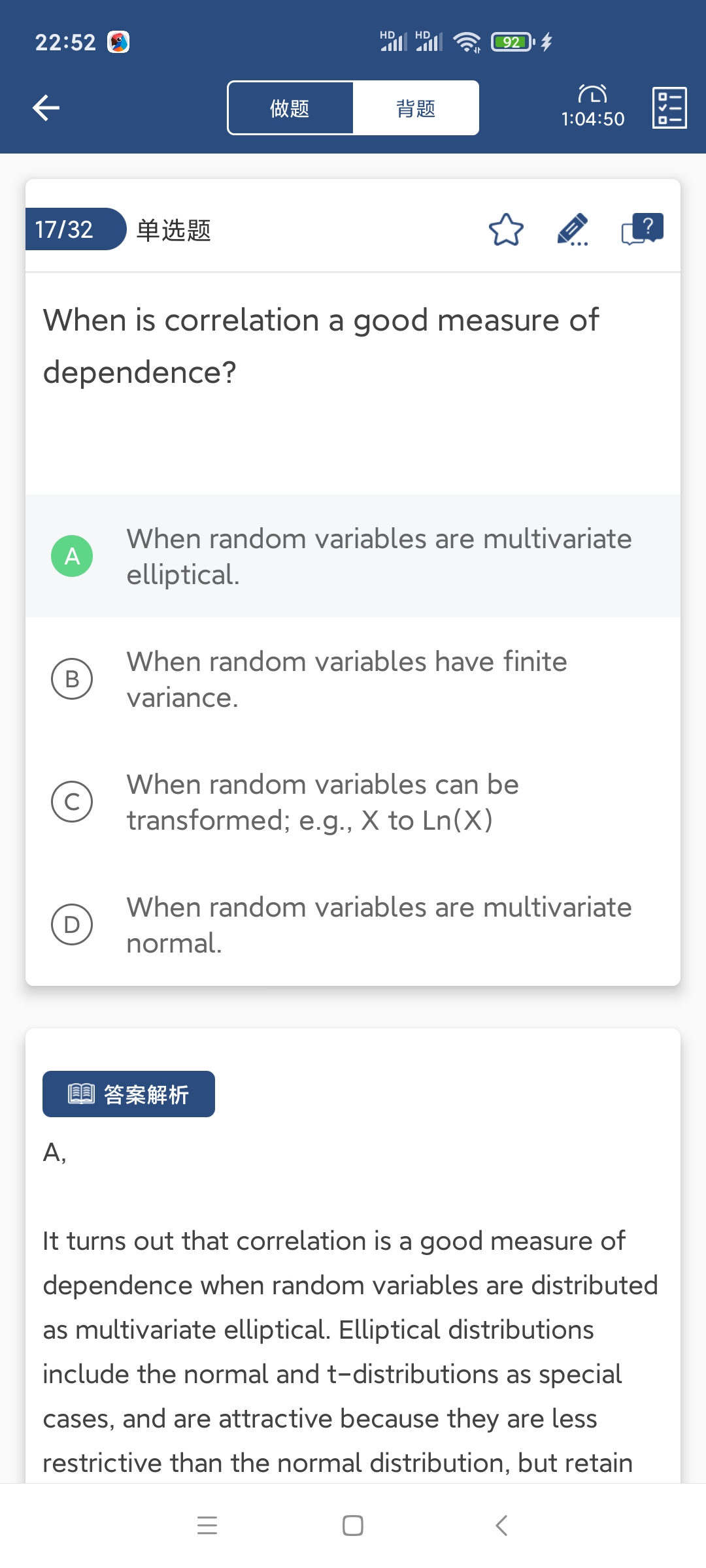 同学你好,这道题有些朝纲,你只需要理解相关系数是衡量椭圆分布(包括但不限于正态分布)依赖性的一种比较好的指标即可。