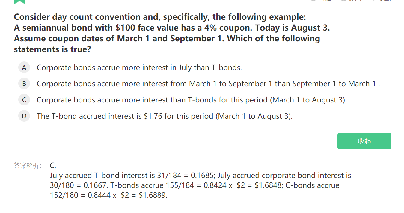 同学你好,国债bond的计息是按照实际天数算的,企业债是按照一个月30天算的,所以会有差距,这道题有两个时间段,一个是7月多少天,一个是从3.1-8.3,分别都有两种天数。