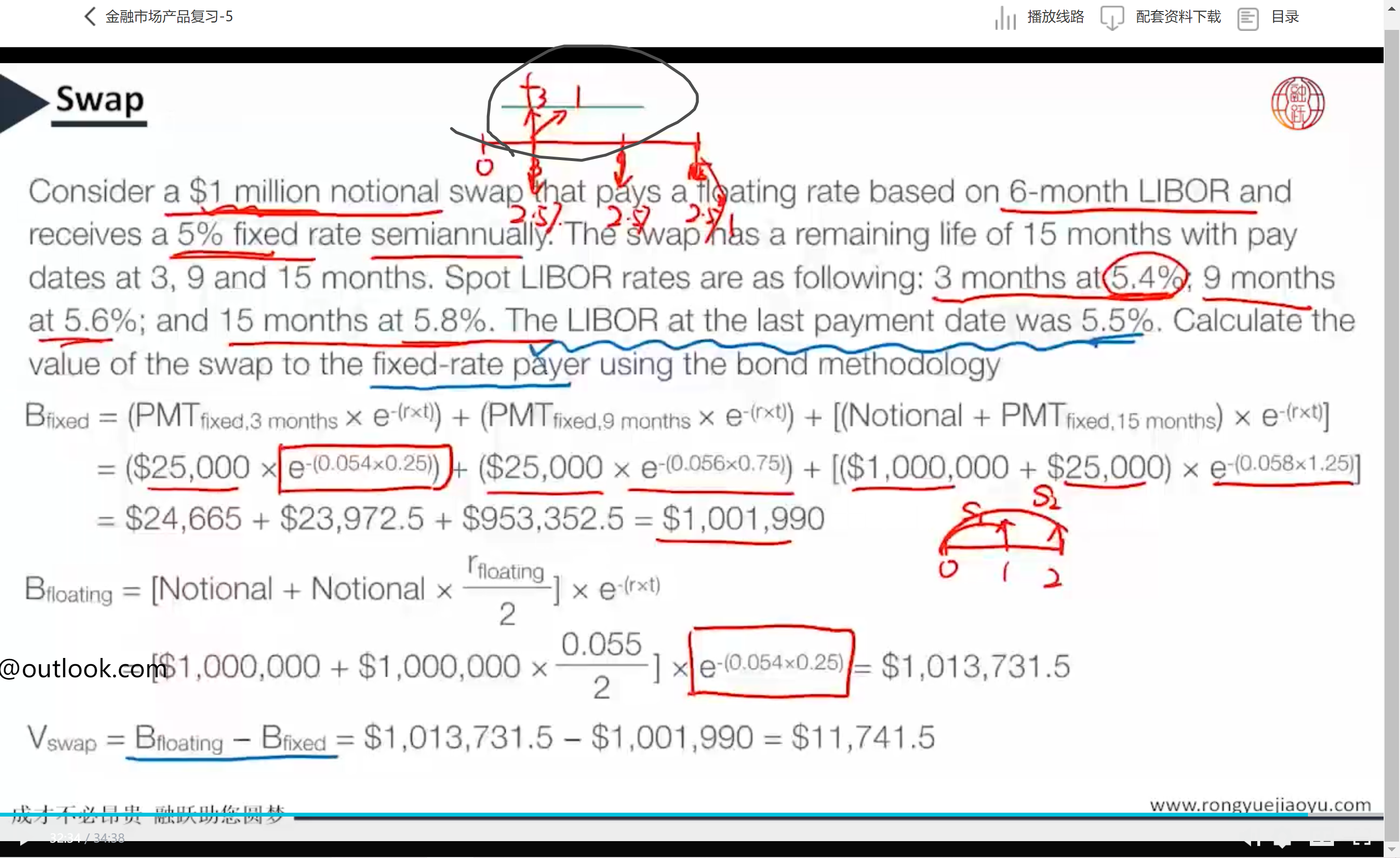 同学你好,因为在利率互换中,浮动端的价值计算遵循在付息日回归面值的特征,又因为整个互换的剩余期限是15个月,并且是半年付息一次,所以从现在到下一个付息日还剩3个月的时间,所以从下一个付息日折现到现在时刻,只用考虑本金和这3个月期间的现金流。