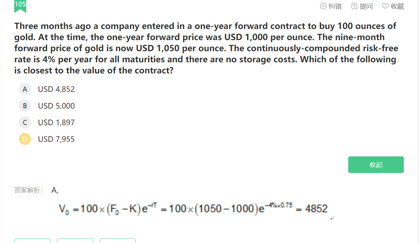同学你好,答案没有错的。远期合约的价值就是在过去3个月签订远期合约(一年期)价格(1000)比现在签订远期合约(9个月)价格(1050)便宜50,然后再把这个收益从一年后折现到现在(9个月)就是现在远期合约的价值。