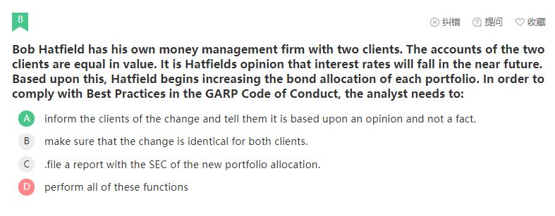同学你好,题干中已说明是利率的变动是基于投资经理的观点而非事实,所以对这两个客户的账户的操作也是不妥当的,除非有客户的授权,另外只有在客户或上司的投资账户中发现非法的操作时可以让SEC报告,而此点并未在题干中提及。