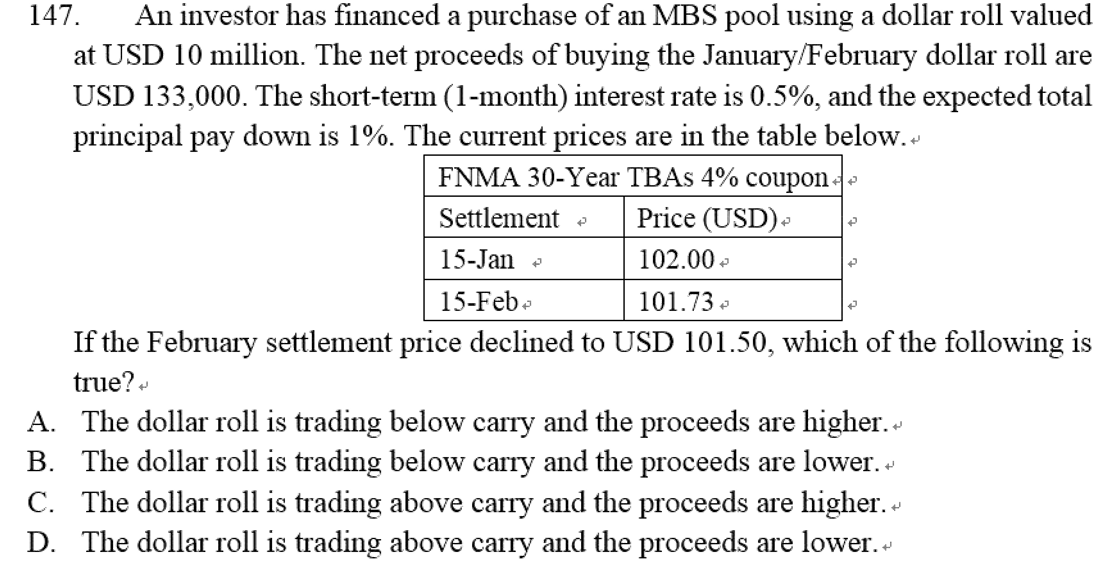 同学你好,这道题选D的原因是把选项中的proceeds当作是dollar roll交割价下降之前的proceeds(133000),所以是133000比155924更低,但我个人倾向于把选项中的proceeds当作是dollar roll交割价下降之后的proceeds,也就是选D。