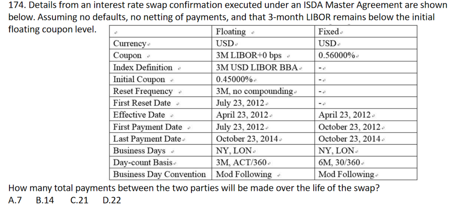 同学你好,这道题考察的就是利率互换中的总的现金流交换次数,抓住几个关键点(首次交换和最后一次交换时间点、交换频率即可,然后查一下总期限内的交换次数相加即可。