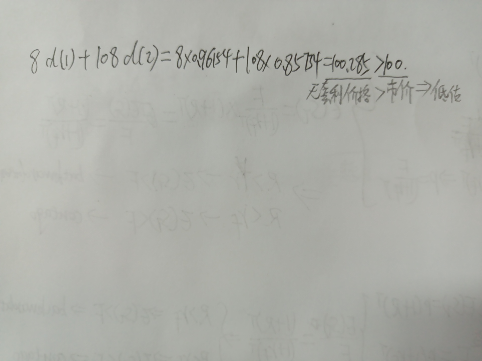 同学你好,这道题解题思路是,利用一年期和两年期的零息债券计算出一年期的折现银子d(1)和两年期的折现因子d(2),然后带入两年期的付息债,计算出两年期附息债的理论价值(也就是无套利价格),然后跟市场价100作比较,无套利价格如果大于市场价格,说明目前该两年期的附息债被低估。计算过程参考图片理解