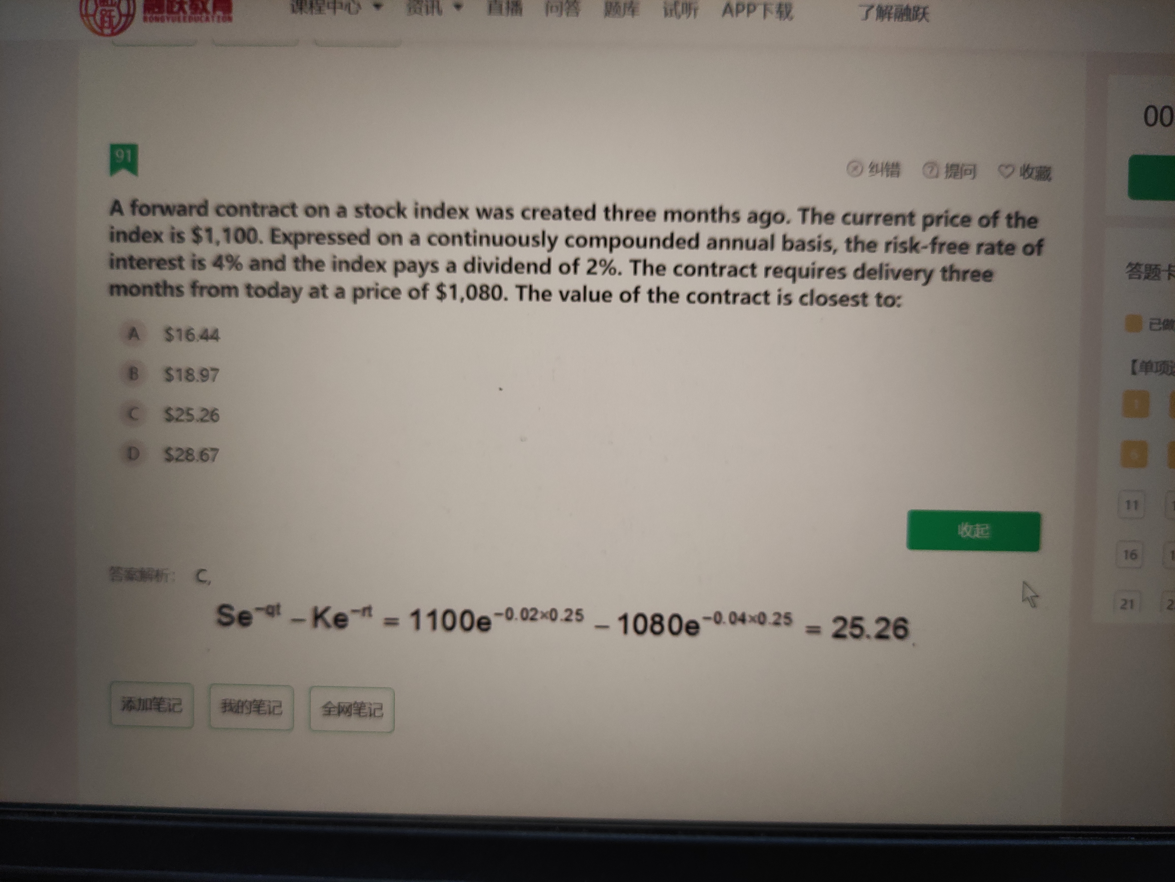 同学,远期合约的价值计算公式是S-F×e^(-rt),在这个题目中,因为有股利支付的存在,所以要对S进行调整,也就是乘以e^(-qt),代入题干中的数据就可以得到结果了哈