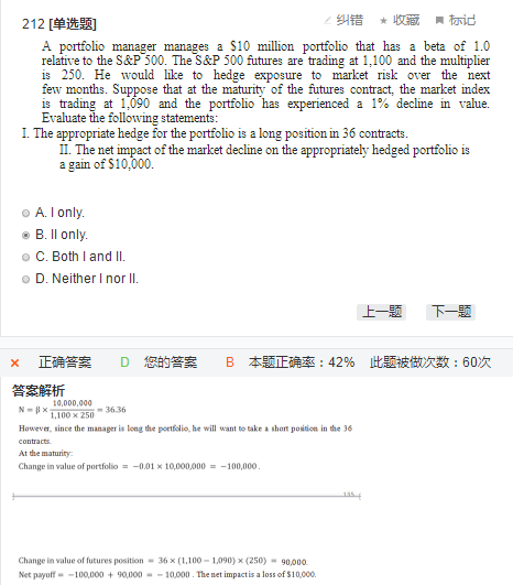这道题考的就是一个对冲。 题目给到了已有的头寸是10million,以S&P为基准的beta=1,用标普500指数期货对冲,现在标普500指数期货的价格是1100,计算需要多少的标普500指数期货,这就是计算出36.36的那个式子了。因为10million是多头,所以标普500指数期货的合约应该是空头,所以第一个说法就错了。 第二个问题,投资组合的价格下跌了1%,所以损失了金额是1%*10million=10,000,是损失,但是他说的是gain,所以第二个说法也错了