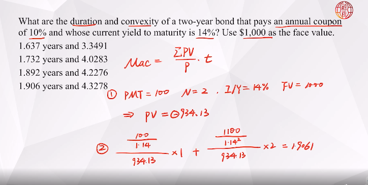 同学你好,这道题就是五要素法先求出来债券的现值,然后用麦考利久期的定义计算出来久期后,就可以选出正确答案。