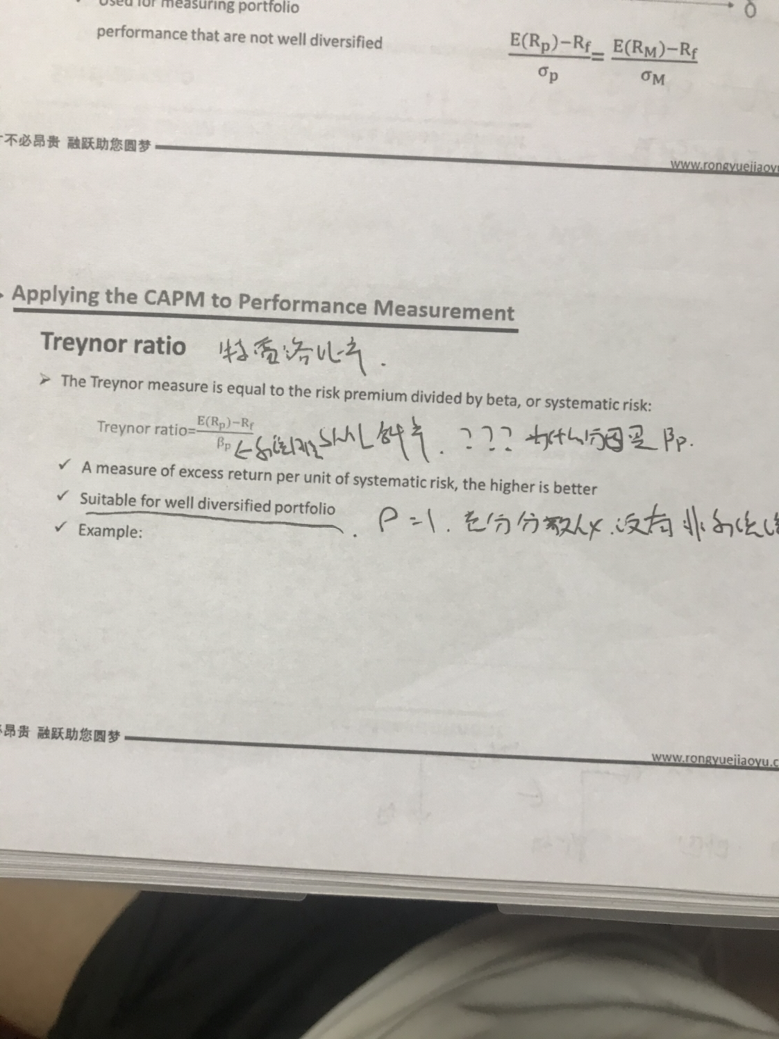 同学,1.特雷诺比率的公式你记错了哈,分母是beta p,表示该投资组合的系统性风险,也就是分散化后的结果;2.特雷诺比率表示的是承担一单位的系统性风险可以获得多少超额收益,总风险等于系统性风险加上非系统性风险,非系统性风险是可以分散化投资降低的,所以特雷洛比率适合分散化组合,建议回归课程再回顾一下哈