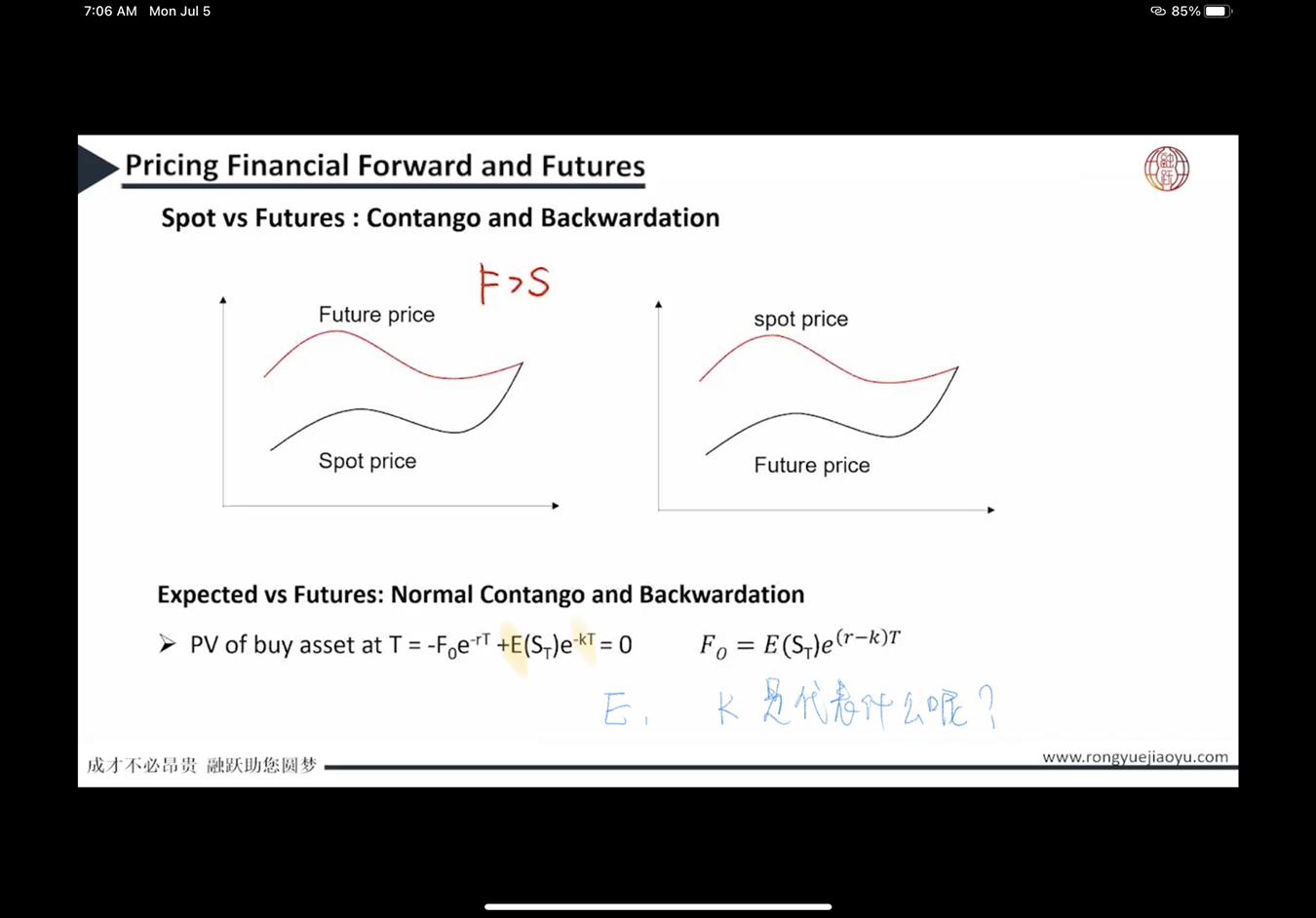 同学,1. 期货是标准化的远期合约,定价原理是一样的哈;2. E表示expected value,也就是期望价值,K表示执行价格;3. 对的同学,当前价格就是S