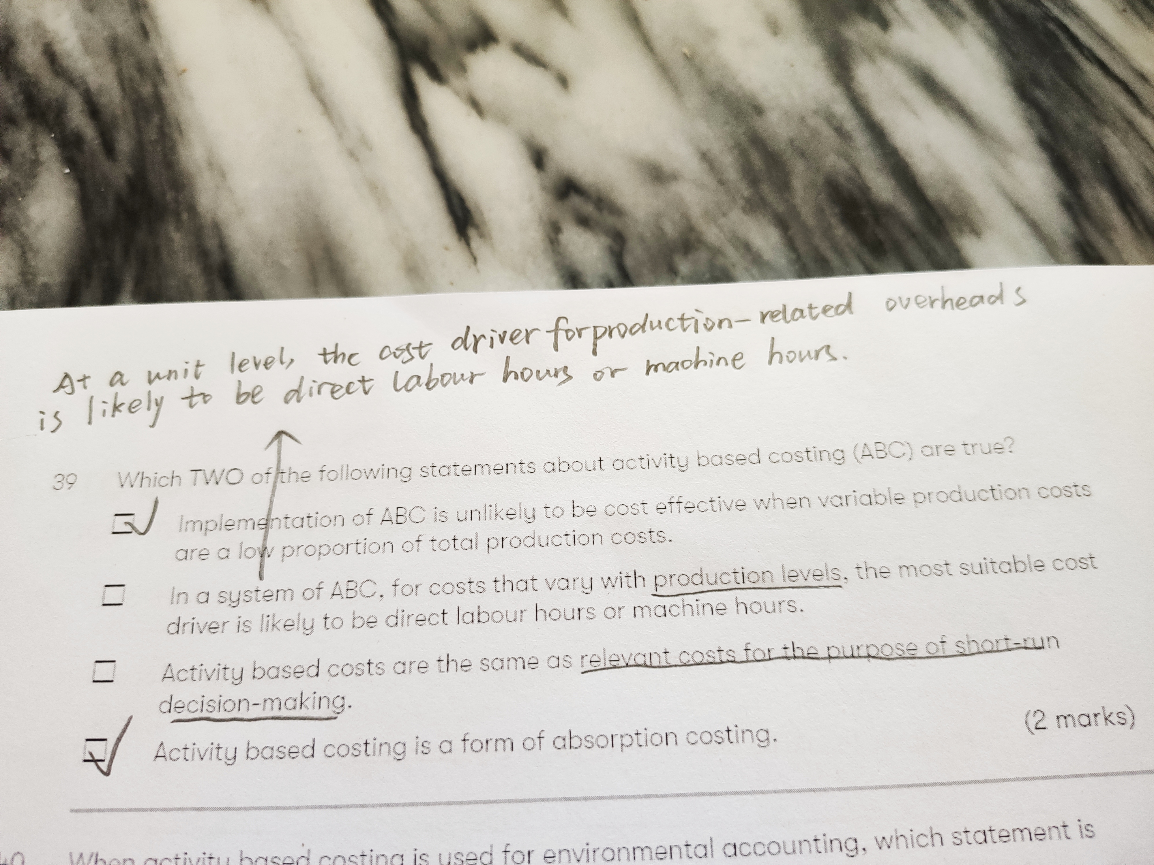 同学,选项2:在ABC系统下,如果成本随着生产水平的变化而变化,最合适的cost driver是direct labour hour or machine hour。因为生产水平或者说数量是跟direct labour hour or machine hour很相关的,工作小时数久生产的数量会多,那么用它做cost driver就比较合适。