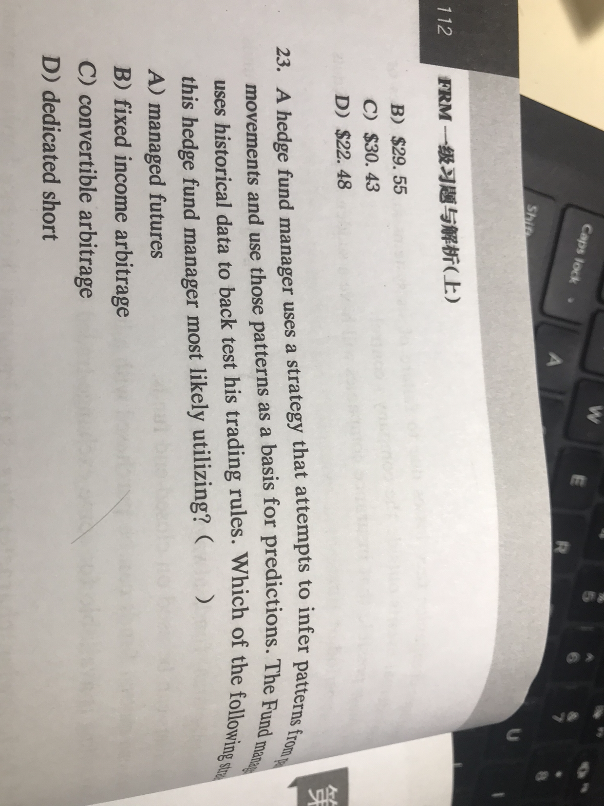 同学,题干意思是说对冲基金经理使用一种策略,试图从过去的价格变动中推断出模式,并将这些模式作为预测的基础。基金经理经常用历史数据来检验他的交易规则。这位对冲基金经理最有可能采用以下哪种策略,管理期货对冲基金试图通过技术分析或者基本面分析去预测现货价格未来的波动,技术分析主要通过过去的价格数据来总结规律作为预测依据, 当技术分析被使用的时候,基金经理将利用历史数据回测他们的交易规则 ,是符合题干中的描述的哈