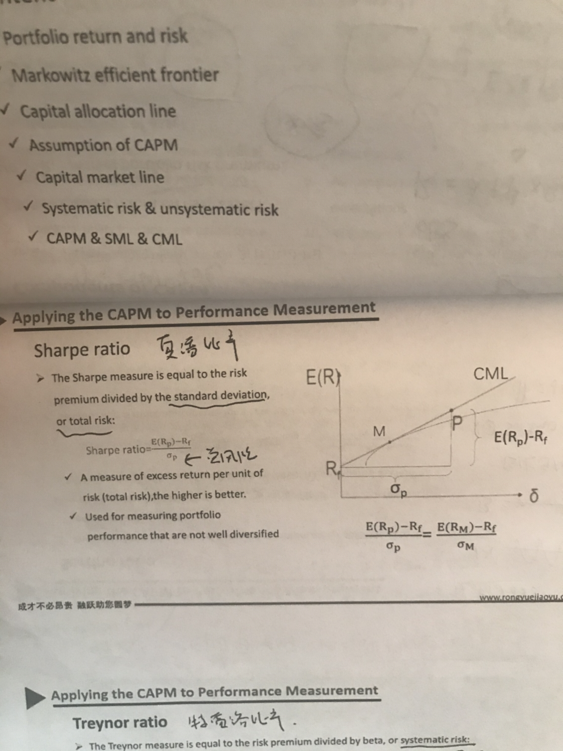 同学,CML的完全分散化表示的是,CML是无风险资产与市场组合M的连线,而市场组合中包含了所有投资,所以是分散化的,夏普比率表示承担一单位的风险可以获得多少的超额收益,这里的风险是总风险,也就是系统性风险与非系统性风险之和,所以是没有分散化的哈