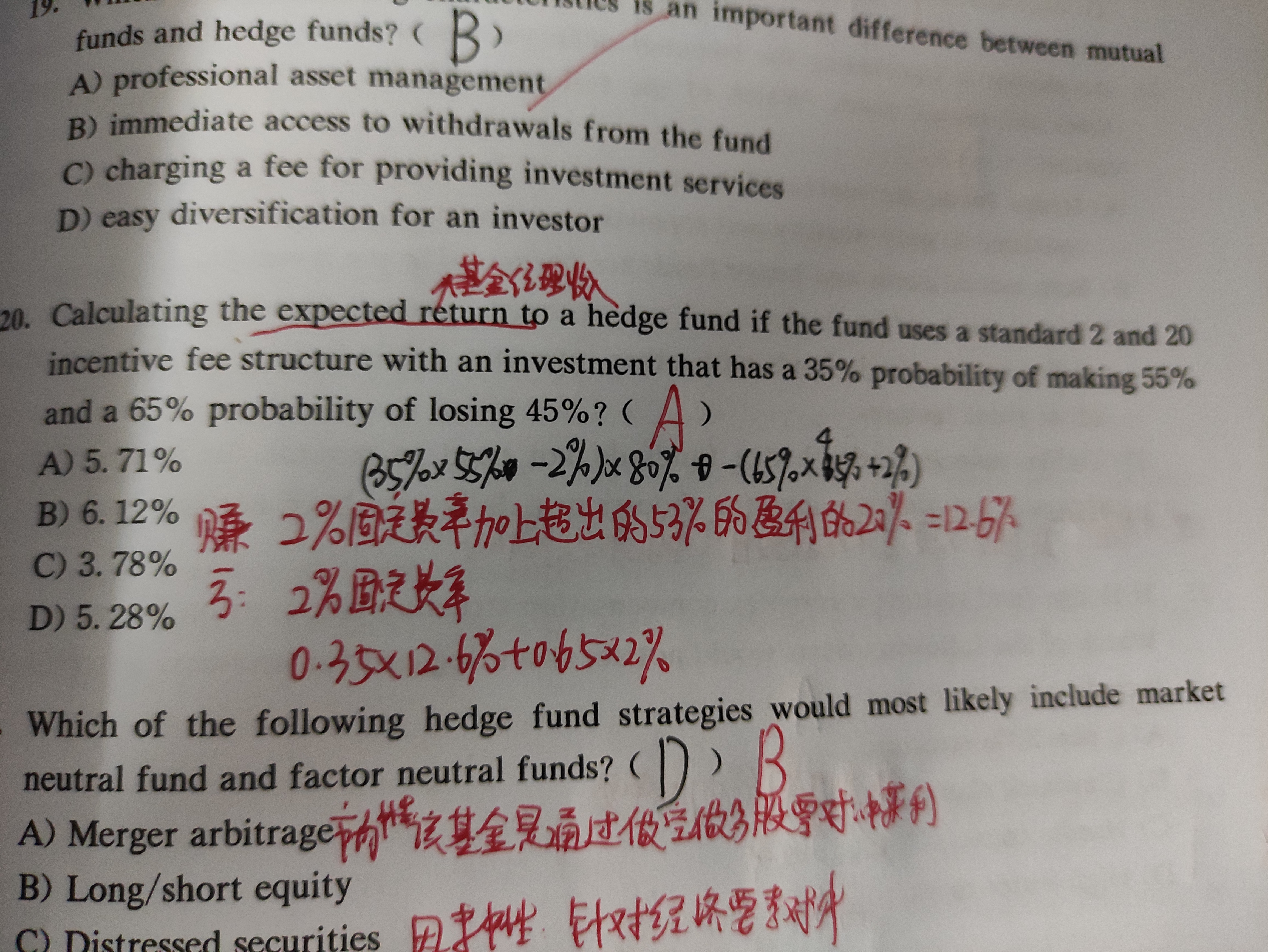 同学,对于对冲基金预期收益的计算,如果是net的话就是要减去管理费,如果没有net就不需要减去管理费,这是在CFA里面的知识点,在CFA中对于这块知识点出题会比较严谨,但在FRM中对于这个知识点只是了解掌握即可,题型也比较少,不用过度纠结,可以两种都算一下选出正确答案哈