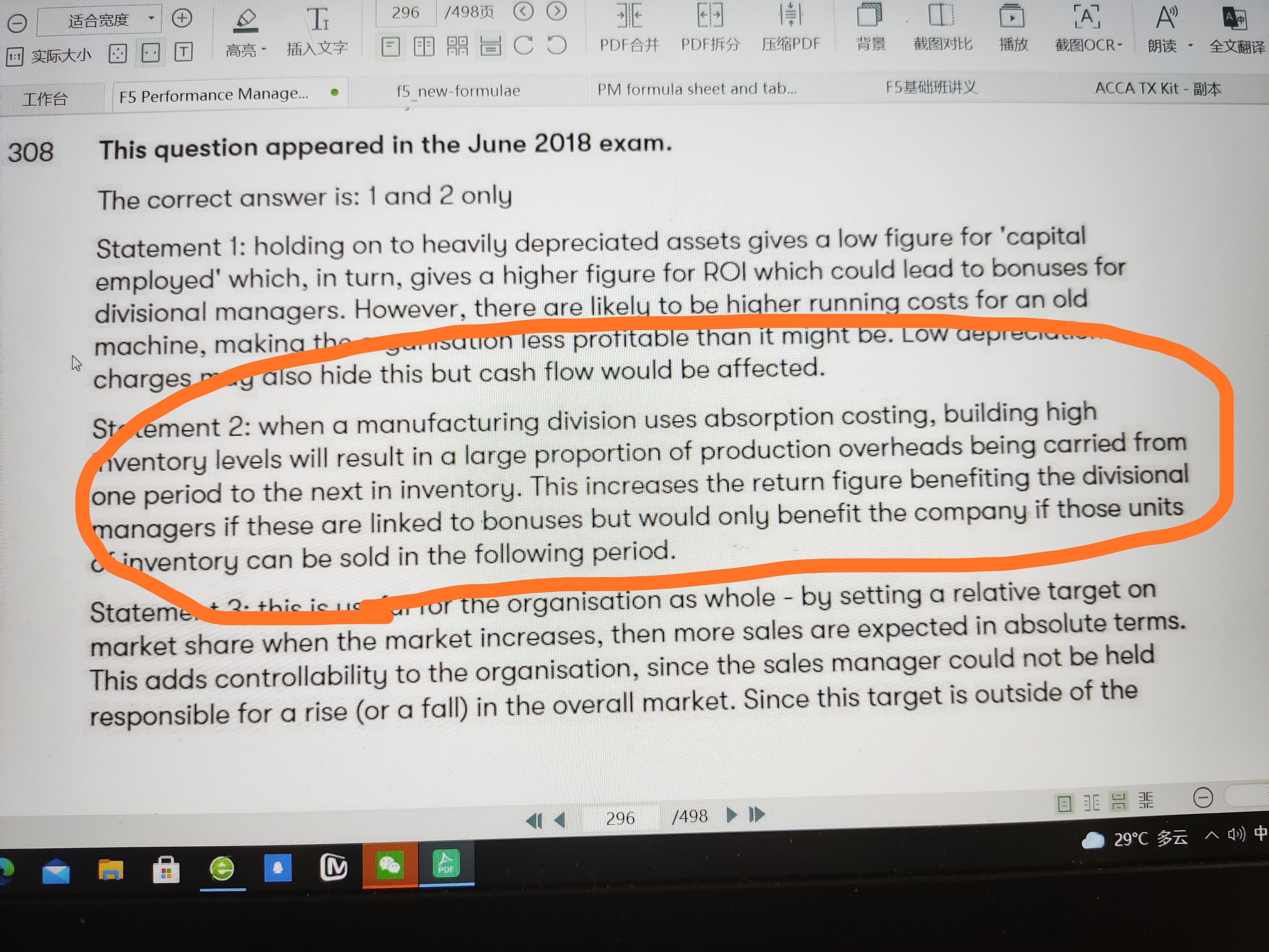 同学,当制造部门适用AC成本法,有大量的存货量会导致大比例的生产成本会从一个期间携带到另一个期间,就是本年的会转移到下年。本年的成本就会降低,本年的return利润就会上升。如果管理层的奖金是与本年的利润挂钩,就会高估,有利于管理层,不利于公司,但是如果这个存货在下年卖出了就没有关系,也会有利于公司。