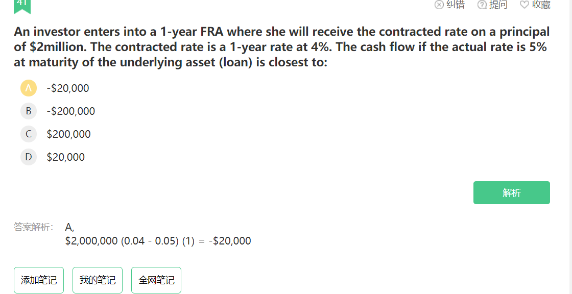同学,是对于FRA现金流的考察,可以回顾一下第三门金融市场与产品FRA and Interest Rate Futures章节对于FRA价值求解的课程哈