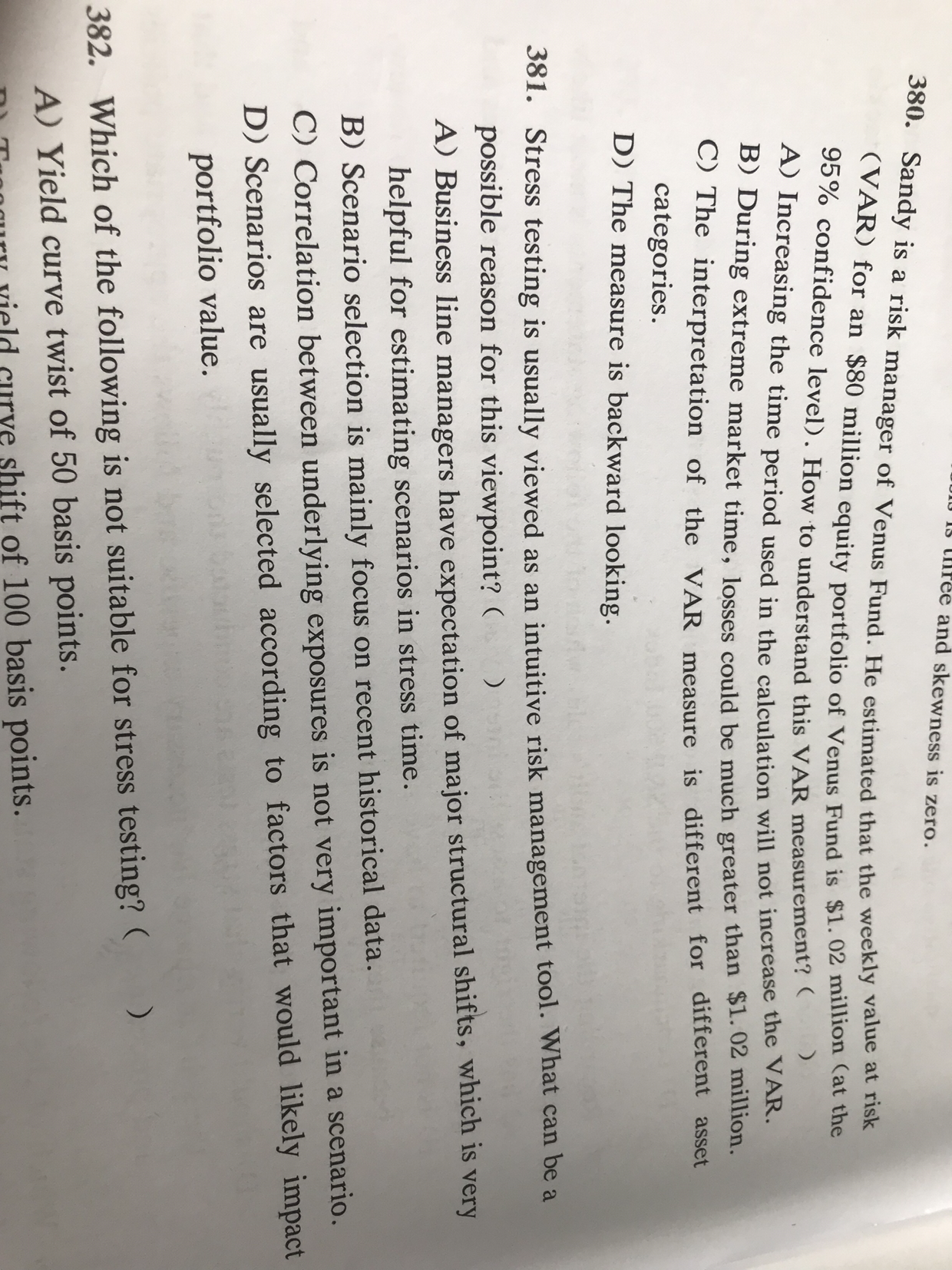 同学,题干意思是说压力测试通常被视为一种直观的风险管理工具,这种观点的可能原因是哪个,A选项意思是业务线经理对主要的结构变化有预期,这对于估计压力时间内的情景非常有帮助,是错误的哈,压力测试不依据业务线经理的预期而改变或受到影响;B选项意思是场景选择主要关注最近的历史数据,是错误的哈,场景的选择是按照历史发生的重大损失事件作为参考的;C选项意思是在一个情景中,潜在风险之间的相关性并不十分重要,是错误的,潜在风险之间的相关性不容忽视;D选项意思是通常根据可能影响投资组合价值的因素选择情景,是正确的,要依据需要来选择情景哈