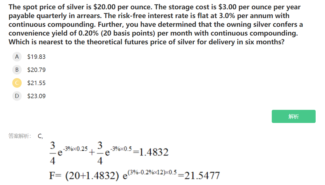 同学,这个题目是对于有便利性收益和储存成本的银期货价格的计算,首先计算出了储存成本的现值,然后按照加成本减收益的公式计算即可哈