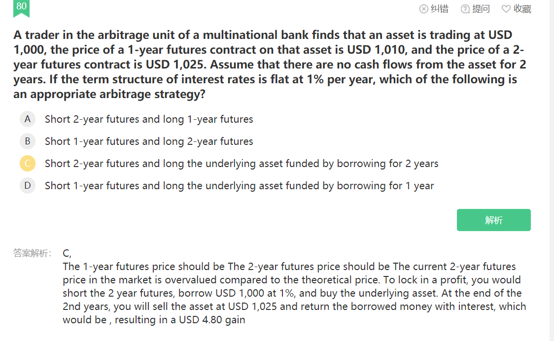 同学,由于理论价格和市场价格出现偏差,所以出现套利机会,一年期期货的理论价格是1000*e^(1%*1)=1010.05,两年期期货的理论价格是1000*e^(1%*2)=1020.20,一年期期货的理论价格与市场实际价格相差无几,两年期期货的理论价格低于市场实际价格,所以在市场上卖出两年期期货,为了匹配对应的现金流还要融资买入现货,也就是C选项的策略哈,1025-1020.20=4.8