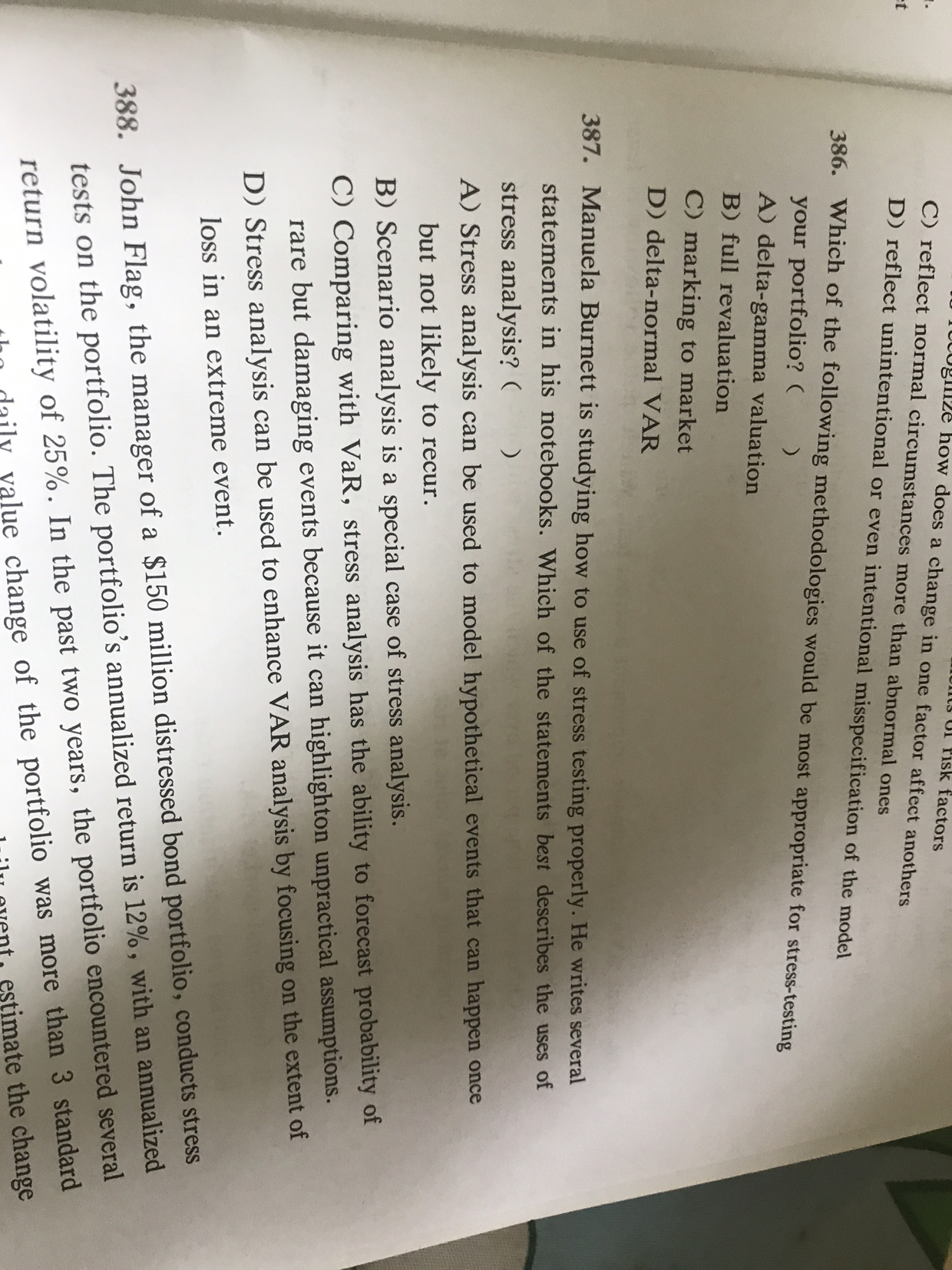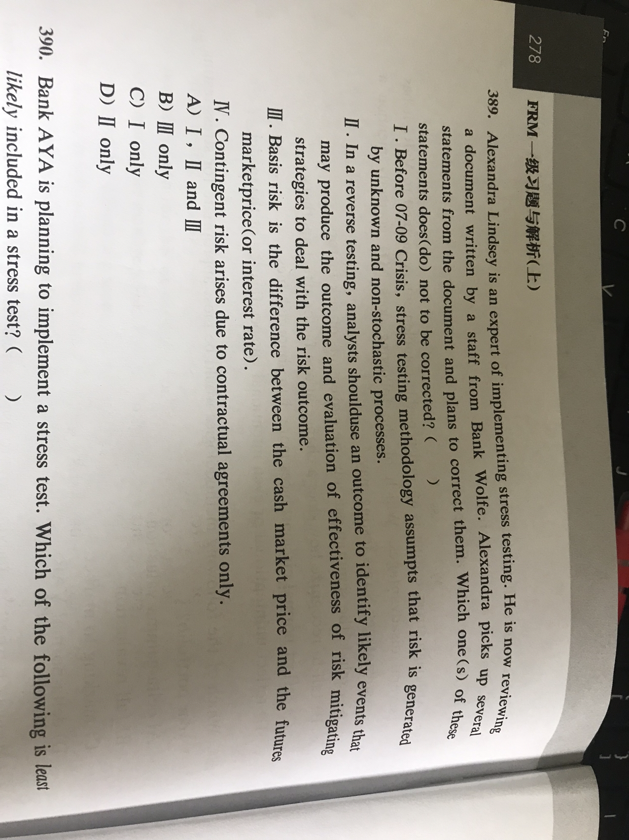 同学,是哪里不懂最好说出来哈,这样老师有针对性的为你解答。386题考察的是对于投资组合进行压力测试时最适用的方法,一般使用full revaluation方法全面测量;387题D选项正确,压力事件可以重复发生,所以A选项错误,压力分析是情景分析的特例,所以B选项错误,压力分析的假设并不是不可操作的,所以C选项错误;389题第二句话正确,在次贷危机之前,压力测试方法常常假设风险是由已知和非随机过程产生的,所以第一句话错误,第三句话搞混了基差和基差风险的定义,所以错误,或有风险一般是指可能因特定事件而产生的风险,所以第四句话错误