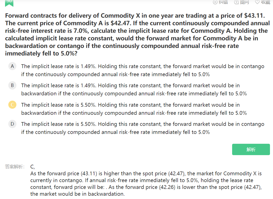 同学,首先我们使用远期合约的定价公式得到租赁利率为5.50%,然后使用新的无风险利率和计算出来的租赁利率求出新的远期合约的价格为42.26,小于现货价格,所以是backwardation哈