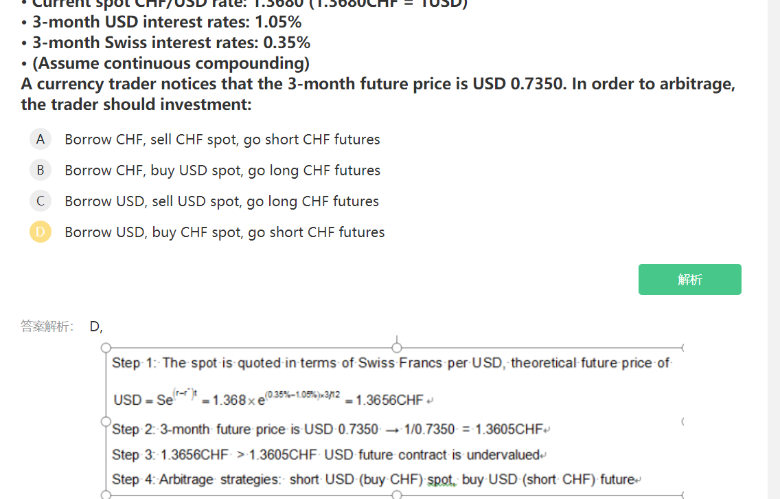 同学,我们通过前面几步对外汇期货价格的计算,得到USD的期货市场价格为1/0.7350=1.3605,与我们计算出来的理论期货价格1.3656存在差异,也就出现套利机会,因为1.3605小于0.3656,USD的期货市场价格被低估,应该买入USD期货,卖出USD现货,卖出CHF期货,买入CHF现货