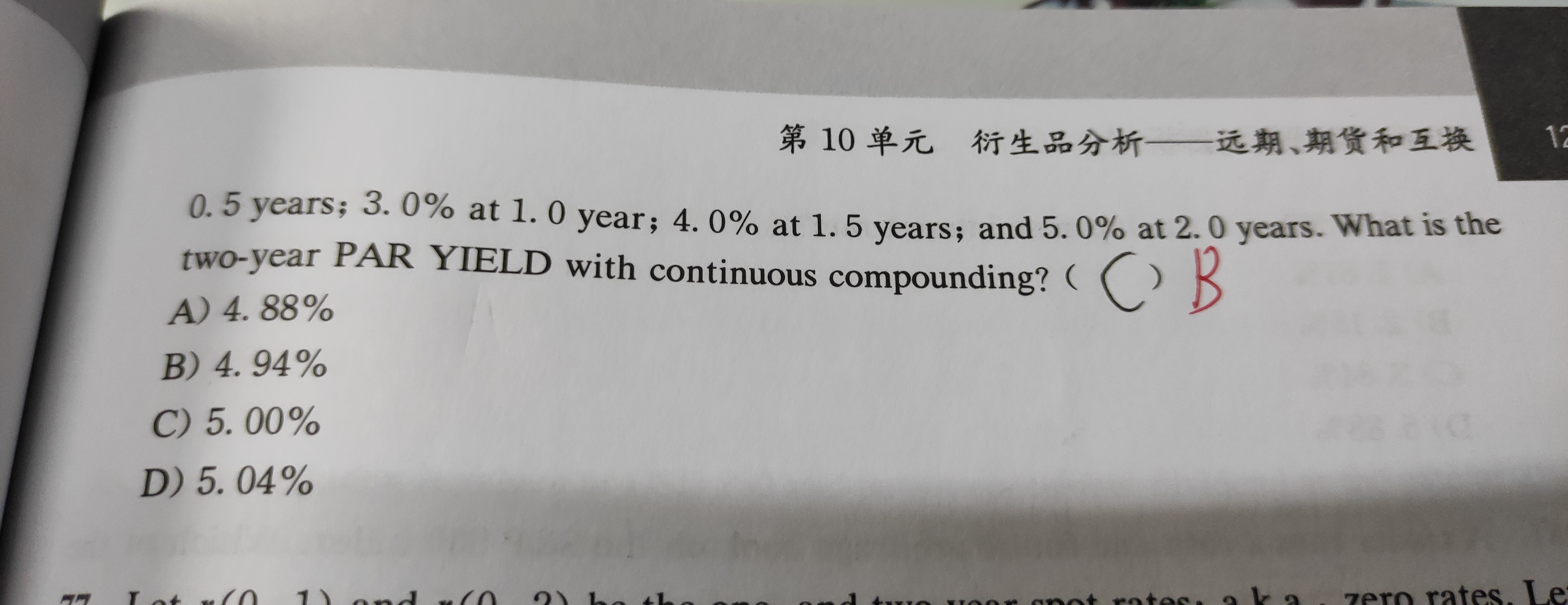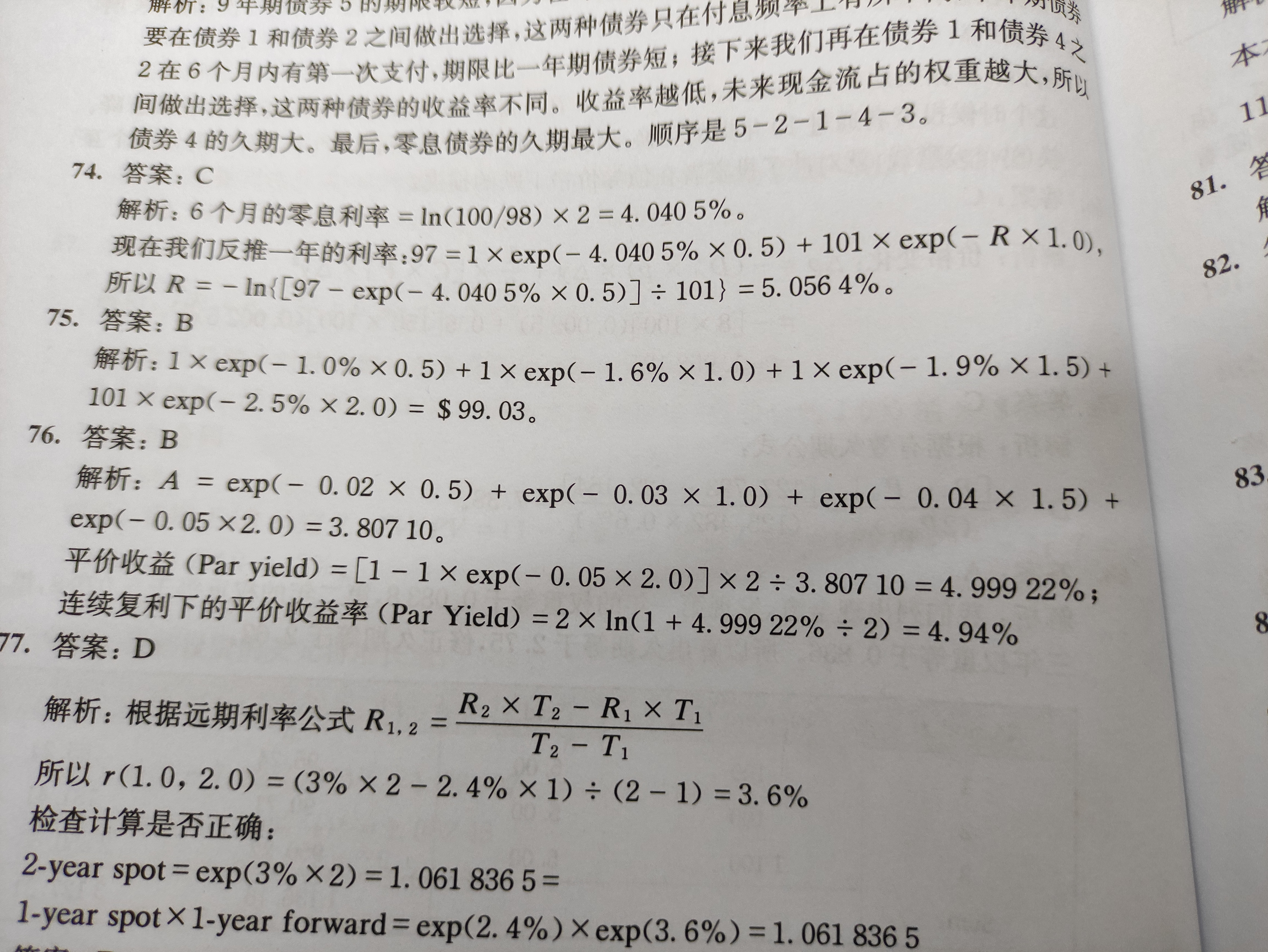 同学,第一二行的公式是合起来看的,解析中把它拆开了,可以这样列式哈,100=c/2*[e^(-2%*0.5)+e^(-3%*1)+e^(-4%*1.5)+e^(-5%*2)]+100*e^(-5%*2),解得c=4.9992,coupon rate=4.9992%,然后将半年复利一次的息票率coupon转换为连续复利,e^(par yield*1)=(1+4.9992%/2)^2,解得par yield=4.9377%