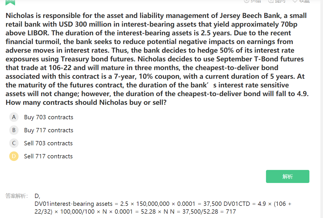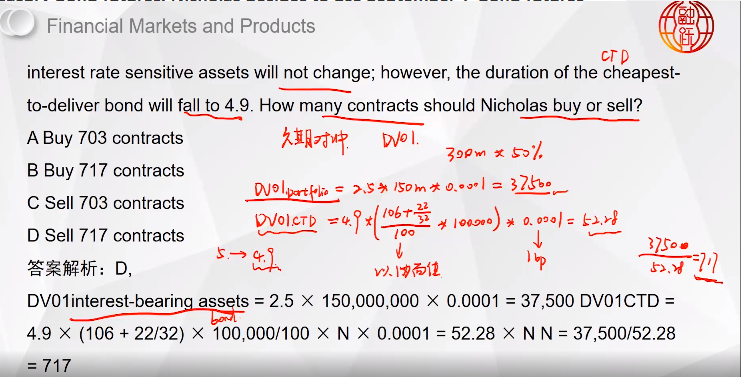 同学你好,这道题就是用美国国债期货合约去对冲目前的利率敏感资产敞口(300M*50%),方法就是先计算出利率敏感资产敞口的DV01,再乘以敞口价值(300M*50%);然后计算出对冲工具国债期货的DV01「(久期*报价/100)*面值*0.0001」,最后用利率敏感资产的敞口37500除以一份国债期货合约的价值就等于需要对冲合约的数量。参考图片理解