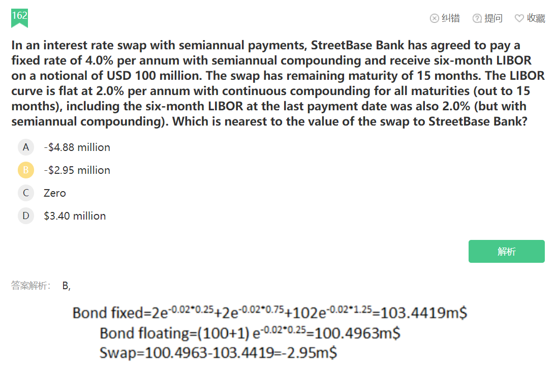 同学你好,对于利率互换而言,计算浮动端的价值分为两种情况,第一种,在付息日,此时等于面值,第二种,不在付息日,此时等于从上一个付息日开始到现在所产生的利息(谨记此刻用的是上一个付息日支付的利率(一般用LIBOR表示,此题中是2%);而固定端的价值就是常规的固定利率债券现金流折现求和了(谨记此题每个期限的折现率都是2%,可以理解为YTM,此处跟你问的上一道题不同,上一道题是不同期限的折现率不一样)