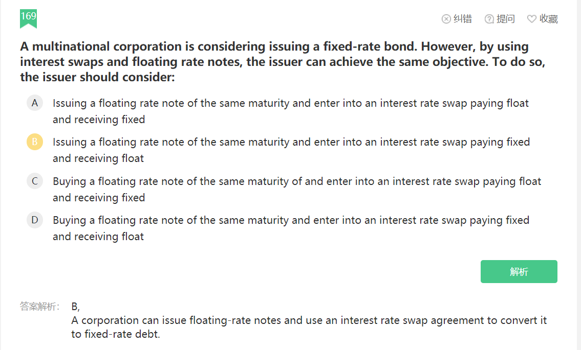 同学你好,题干中这个跨国公司的目的是发行一个固定利率债券,也就是未来要支付一系列固定利息(票息)的债券,而B选项中是进行了两个操作,一个是进入一个利率互换,付固定利息(这点比较符合该公司的目的),同时收浮动利率;第二个操作是发行一个浮动利率债券(付浮动利息),这点这号可以把第一个操作中的收浮动利息对冲掉,所以最后留下的敞口就是付固定利息,跟最初的目的是一致的。