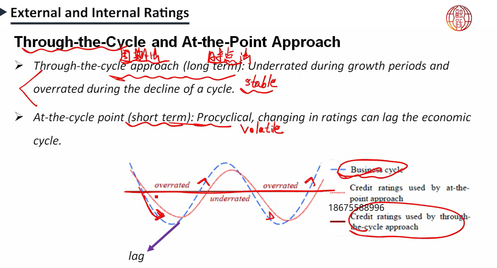 同学你好,through -cycle-approach法你可以理解为是一个平均在评级有效期内始终处于一个平均水平,当经济下行时,评级本应是下调的,但由于周期法的滞后性,评级被高估(太乐观了),也就意味着违约概率被低估了(太乐观了),两者是一致的。