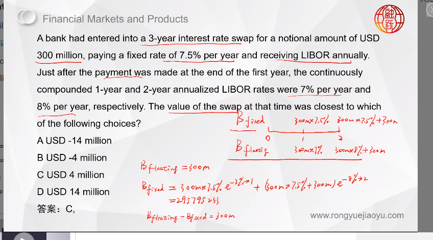 同学你好,固定一方的价值计算过程是:300*7.5%*e^-7%+300*7.5%*e^-8%*2,票息率是7.5%而不是7%。