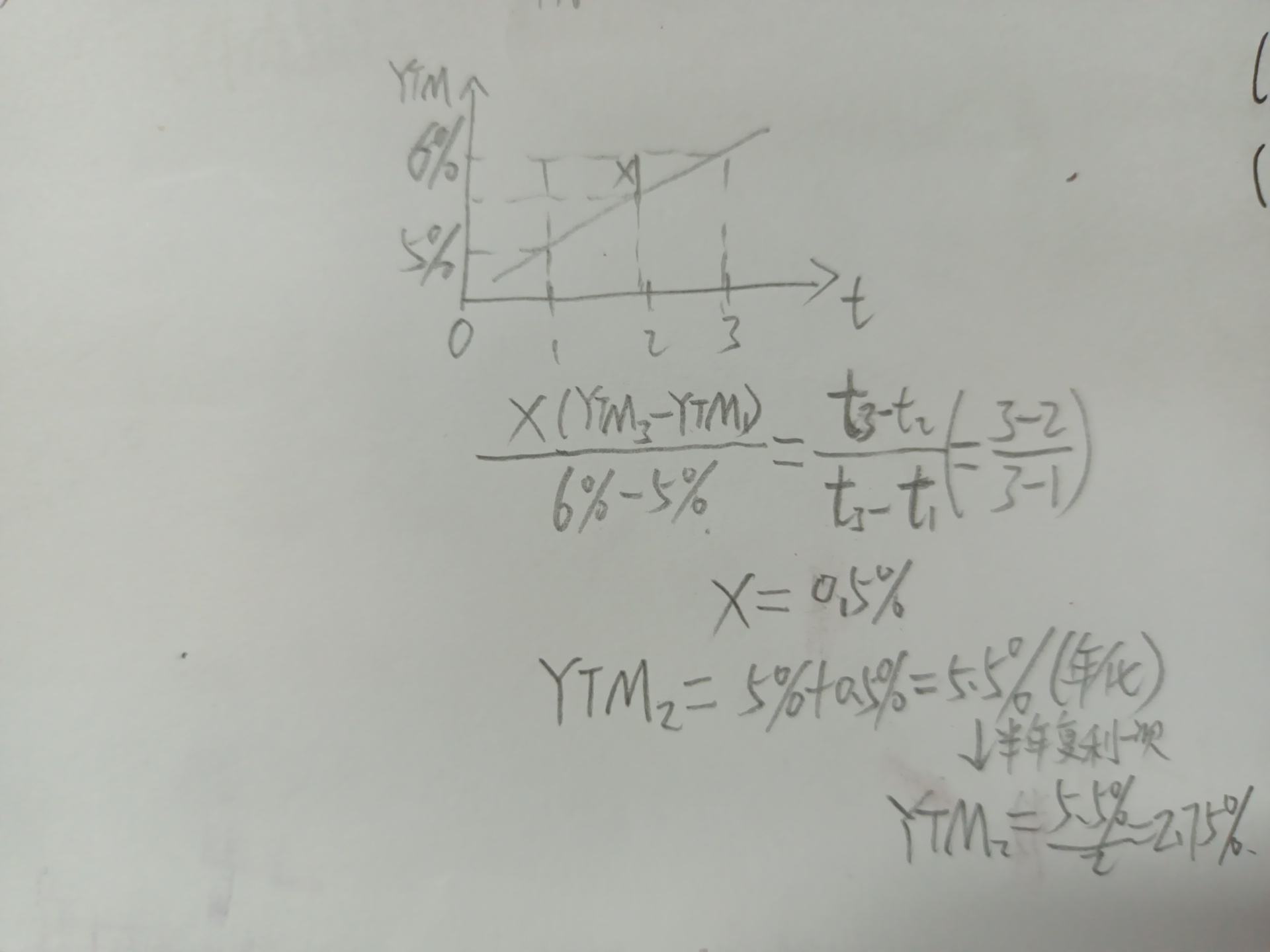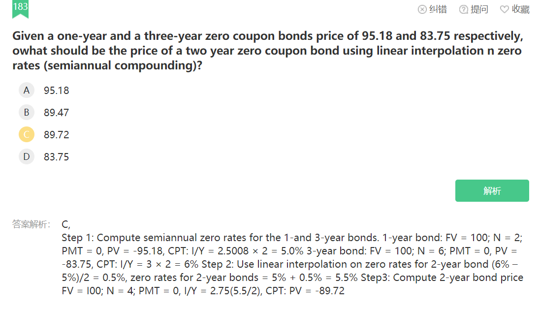 同学你好,这道题就是已知一年期和三年期债券价格,利用货币时间价值五要素计算出各自的YTM,然后再利用线性插值法计算出两年期的YTM,然后再利用货币时间价值五要素倒推出两年期零息债券的价格。关于线性插值法的理解参考图片,另外注意题干中的利率是半年复利一次,而折现率需要换成年化的。