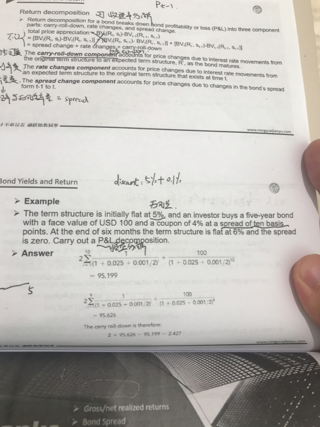 同学你好,损益分解分为三部分,=现金持有收益(票息+价差)+基准利率曲线变化带来的收益(下滑收益carry -roll-down+曲线变化收益Movement)+信用利差变化带来的收益。而这道题题干中已经说明最后9期信用利差为0,所以这个因素就不考虑了(况且在计算carry-roll-down收益时是要求利差变化不变的条件下进行),而票息率是4%也已经给出,所以也不用再计算了,只剩下基准利率曲线变动带来的收益,其中的carry-roll-down收益和利率曲线变动带来的收益是混在一起的,所以就直接放在一起算就好了,carry-roll-down收益指的是在基准利率曲线在持有期保持不变的情况下,即期利率随剩余期限减少而减少(从5年10期变为4.5年9期),此时债券的现金流以更低的利率贴现引起价格升高而获得收益。所以按照5年前时的5%的折现率计算出一个债券价格,然后半年后再用6%的折现率再计算出一个价格(保持信用利差不变),两者想减就是carry-roll-down的收益。