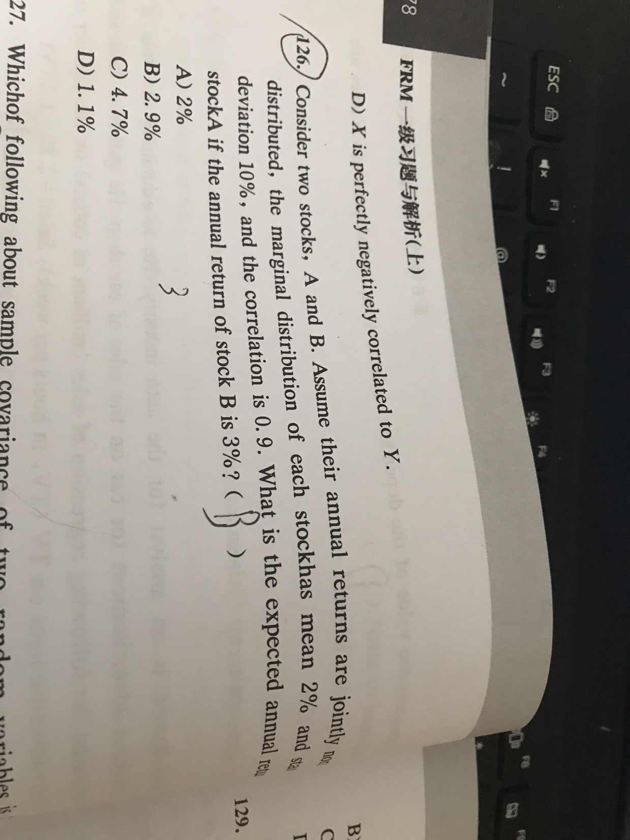 同学你好,这道题有点绕,其实就是先通过股票A和股票B的标准差和相关系数计算出来二者的贝塔值,然后再用股票A的超额收益(相对于其均值)对股票B的超额收益相对于其均值)做回归,已知股票B的收益,带入回归方程得出股票A的收益。