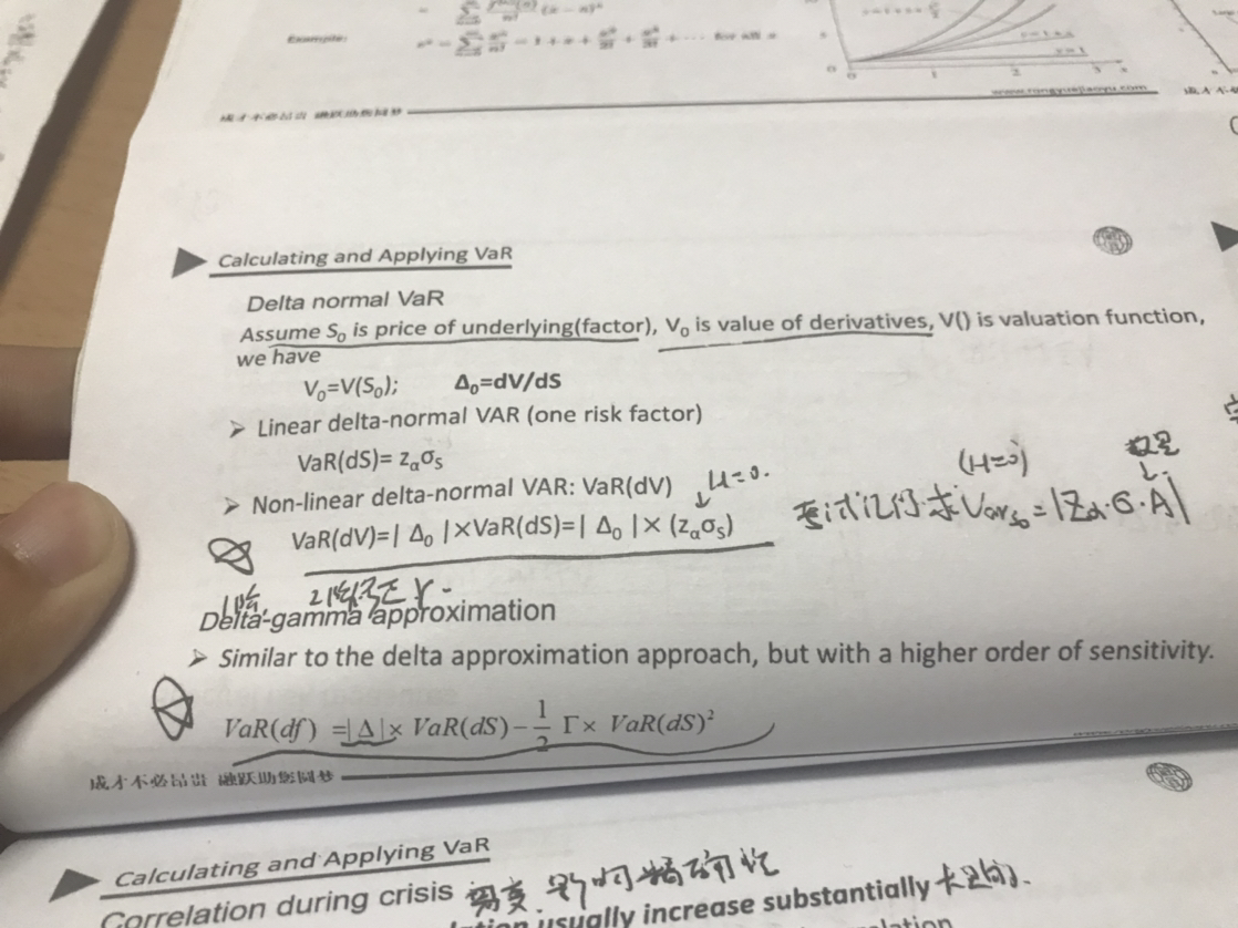 同学你好,图二中的凸性调整公式是减号,因为这个公式使计算VaR的,计算的是损失,对于多头而言,久期是负号,gamma是正号,在考虑久期因素之后,久期前面是负号,代表是损失,同理,gamma前面也是负号,也代表损失;这道题答案中的第一行计算公式有误,直接用delta mormal法计算即可,不用考虑gamma的影响。