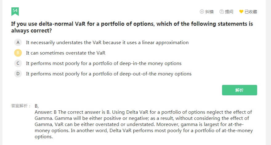 同学你好,这道题的本意是问相比于delta-gamma法计算VaR值,delta-normal法计算VaR在什么情况下表现最差(也就是说最不靠谱),因为delta-normal法相比于delta-gamma法少了一个二阶gamma的影响,所以只有gamma因子变动最大的时候delta-normal法最不靠谱(即少了gamma计算VaR的误差最大),也就是在at-the-money的时候,所以C和D都错。